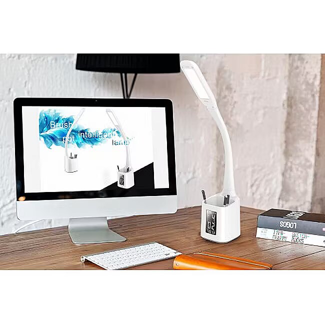 description_short_en - Multifunctional desk lamp with pencil holder Only 7 W power usage 5500 K cool white light 5-step dimmer LCD display for date and time