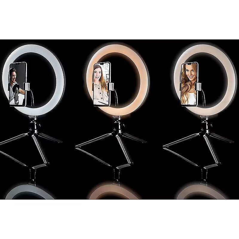 W zestawie desktopowym znajduje się tripod o długości każdego ramienia 19 cm, który po maksymalnym rozłożeniu uzyskuje wysokość 9 cm od podłoża. Wraz ze statywem, użytkownik dostaje dedykowaną obrotową głowicę montażową, łączącą statyw z pierścieniem oświetlającym. Pozwala ona na regulację nachylenia pierścienia w stosunku do statywu, w każdym kierunku. Zestaw jest wyposażony w lampę 26cm, statyw oraz pilot pozwalający regulować natężenie światła oraz barwę światła Lampa posiada 120 diód LED Nasz model emituje światło o temperaturze 2700-7000K. Tłumacząc , jest to równoznaczne z idealnie odzwierciedlonymi barwami znajdującymi się na modelce czy obiekcie fotografowanym. Lampa posiada 3 barwy: zimna, ciepła , neutralna. Każda z barw 10 poziomów natężenia światła co łącznie daje 30 różnych wariacji. Lampa o mocy 10W - emituje światło o mocy 600-1300 lumenów w zależności od włączonego programu. Lampa włączona na programie 10 nie zależnie od wybranej barwy światła emituje bardzo wysokiej jakości światło. Mini statyw posiada obrotową głowicę, która umożliwia ustawienie dowolnego kąta kabel USB o długości 175 cm. Lampa wymaga zasilania 5V DC o natężeniu minimum 500mA (możliwość podłączenia do portu USB komputera), natomiast pełną deklarowaną moc osiąga przy podłączeniu do zasilacza 5V/3A (brak w zestawie).