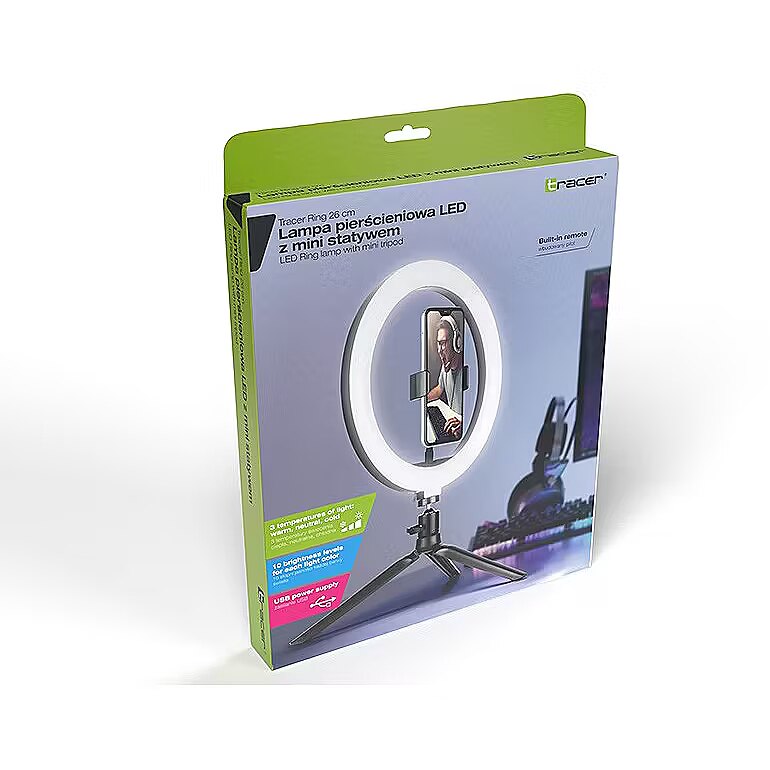 Description - Lampa pierścieniowa Ring 26CM z mini statywem Nawet najlepsza kamera lub aparat nie zapewnią wysokiej jakości obrazu, jeśli filmowany obiekt nie jest właściwie doświetlony. Niezależnie, czy jesteś gamingowym streamerem, nagrywasz filmy na Tik Tok, czy też prowadzisz konto na Instagramie, lampa pierścieniowa Tracer RING na USB wprowadzi nową jakość do Twoich nagrań! Niezbędny element wyposażenia stanowiska gamingowego streamera