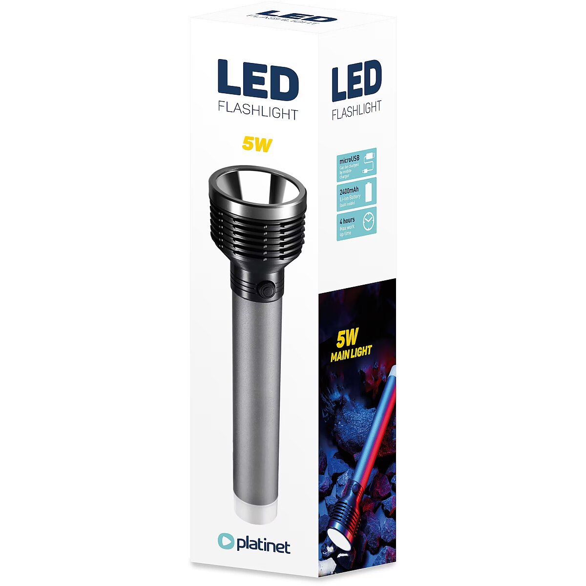 description_en - Platinet high-quality and reliable rechargeable flashlight, can be used both indoors and outdoors. Can also be used as a battery bank 2400 mAh lithium-ion battery 4 hours of working time Rechargeable via mcroUSB 1 x 3W LED & 3 x 0.5W SMD LED