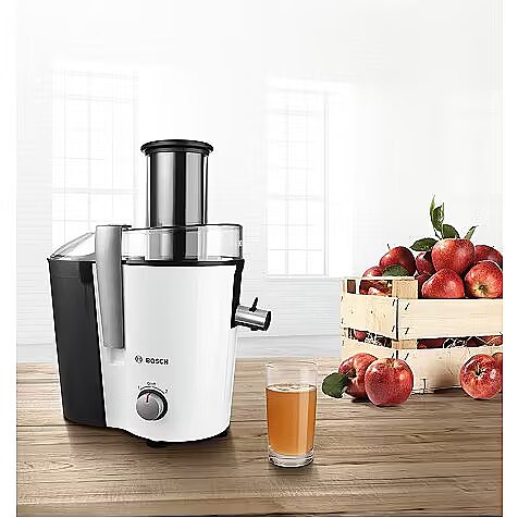LongSummaryDescription - Bosch MES25A0. Product type: Centrifugal juicer, Product colour: Black, White, Control panel colour: Black, Silver. Housing material: Plastic, Jug material: Plastic, Blade material: Stainless steel. Power: 700 W, AC input voltage: 220 - 240 V, AC input frequency: 50 - 60 Hz. Width: 310 mm, Depth: 312 mm, Height: 180 mm. Country of origin: Germany, Warranty period: 2 year(s)