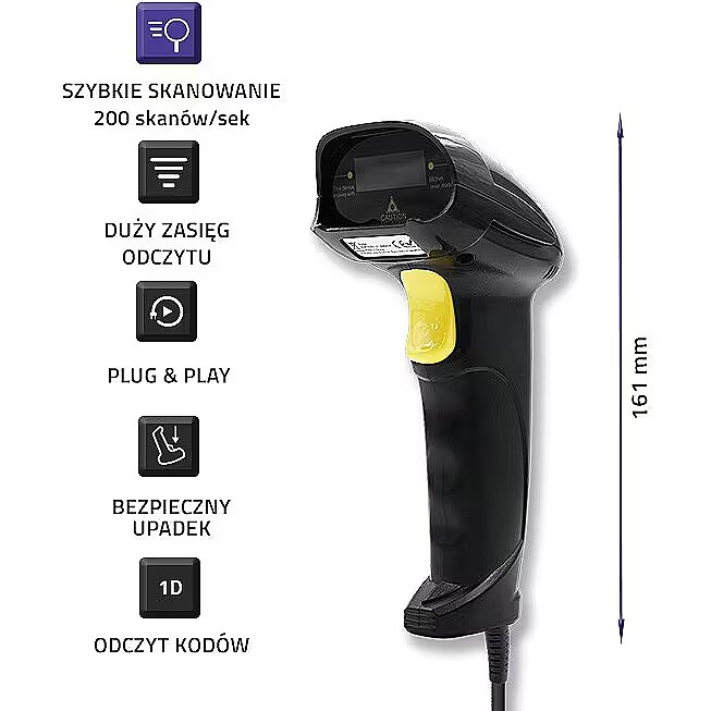 The high quality of our barcode scanners is the result of thoughtful design based on the most important aspects of these devices. We know exactly what you expected of them, so to meet the most demanding working conditions we offer: Plug & Play interface - it guarantees the immediate operation of the barcode scanner without installing additional software, 165 cm cable length - comfortable to use, USB plug - possibility to connect the device to a PC, laptop, the scanner can work 24 hours a day, ergonomic shape - easy to hold.