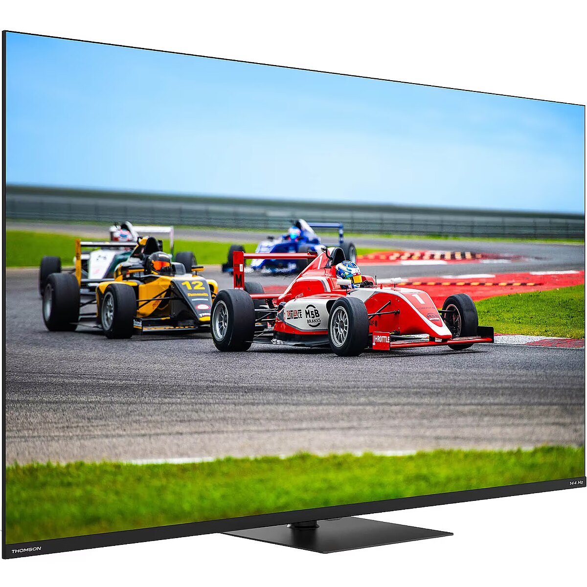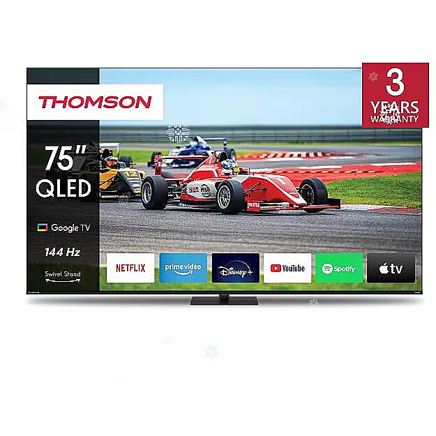 Description - 75QG7C14 THOMSON Experience fluent images and high responsiveness in rich 4K UHD quality with the Thomson Google TV 75" QLED Pro. A 144 Hz refresh rate ensures smooth and responsive visuals, ideal for fast-paced content like action movies, sports and gaming. This feature reduces motion blur and display lag, delivering the most comfortable viewing and gaming experience. Powered by Quantum Dot nanocrystals, a QLED display delivers balanced brightness, striking contrasts, and an expanded color range. Combined with 4K Ultra HD resolution you can capture every detail and immerse yourself in crystal clear images. Dolby Vision technology enhances the brightness in each scene, ensuring precise color reproduction for lifelike images. Enjoy dynamic audio with Dolby Atmos for an immersive TV experience. Google TV simplifies your entertainment by organizing content from your apps and subscriptions. Create multiple user profiles and benefit from curated recommendations. Enjoy a wide range of smart features, such as access to 400,000+ movies and TV shows, smart voice control with Google Assistant, and Chromecast built-in to stream content from compatible smart devices to your TV. The ergonomic remote control with smooth backlighting allows you to keep an eye on everything, even in dim lighting. The integrated Google Assistant enables you to intuitively control your TV with voice commands. Search for your favorite movies, ask for recommendations based on your mood, or control compatible smart devices - all with the convenience of your voice. Benefit from increased placement flexibility with the central swivel stand and enhance your viewing experience. The innovative design enables you to effortlessly rotate your TV by up to 30 degrees, allowing you find the perfect angle for your entertainment setup. The built-in triple tuner makes reception via satellite-antenna, terrestrial antenna, or cable possible. Easily receive all available channels without additional hardware.