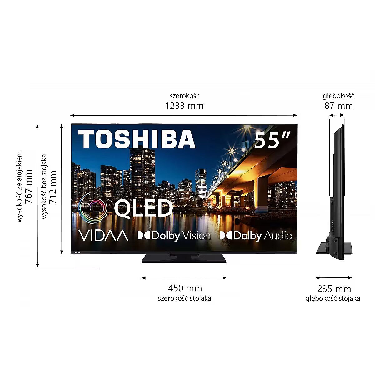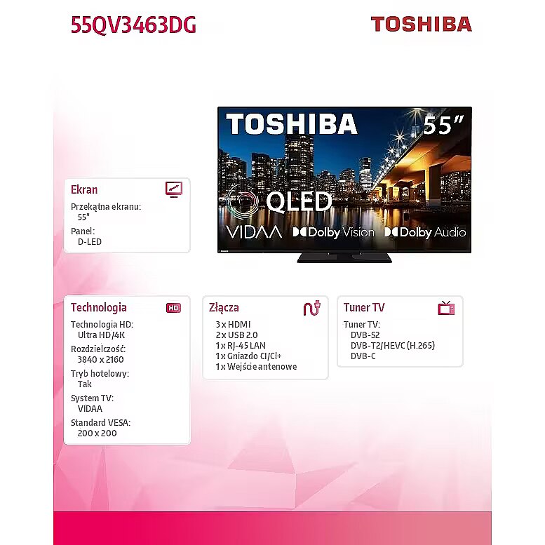 Description - Telewizor Toshiba 55QV3463DG Wszystkie nasze telewizory 4K HDR, odznaczone logo 4K HDR Ultra HD, obsługują i wiernie wyświetlają treści w rozdzielczości 4K HDR w ich pełnej krasie. Dzięki naszym telewizorom Toshiba z systemem Dolby Vision znajdziesz się w samym centrum akcji. Dolby Vision to preferowany przez filmowców na całym świecie format zapisu wideo HDR wykorzystujący metadane do odczytu i dokładnego przeliczania właściwego poziomu jasności dla każdej klatki obrazu TV. Zobacz, co obecnie ogląda świat - od najgorętszych teledysków po popularne gry, filmy, programy, wiadomości, naukę, fitenss i nie tylko. VIDAA dostarcza swoim użytkownikom najlepsze treści globalne i lokalne, zapewniając przy tym łatwość obsługi produktu! Doświadcz rodzaj dźwięku, jaki normalnie można usłyszeć tylko w kinie. Ciesz się autentycznie brzmiącymi dialogami i usłysz więcej z akcji toczącej się na ekranie dzięki Dolby Audio. Ułatwia rozszerzenie odsłuchu dźwięku przestrzennego, zapewniając przede wszystkim percepcję kanałów wysokich, bez konieczności używania dodatkowych głośników. DTS uzyskuje dźwięki otoczenia 3D natywnie bez procesu konwersji dźwięku z 2D na 3D. Poznaj nowy telewizor Toshiba QLED. Ciesz się wysoką, realistyczną jakością obrazu i dłuższą żywotnością telewizora przy maksymalnej wydajności. Telewizor QLED zapewnia głębszą czerń oraz bardziej nasycone, i dokładniejsze kolory. Odkryj przycisk Netflix na pilocie, aby przenieść się z jednej przygody do drugiej.