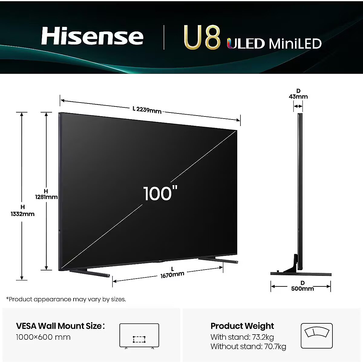 Title - Hisense 100U8Q 2.54 m (100") 4K Ultra HD Smart TV Wi-Fi Black, Grey