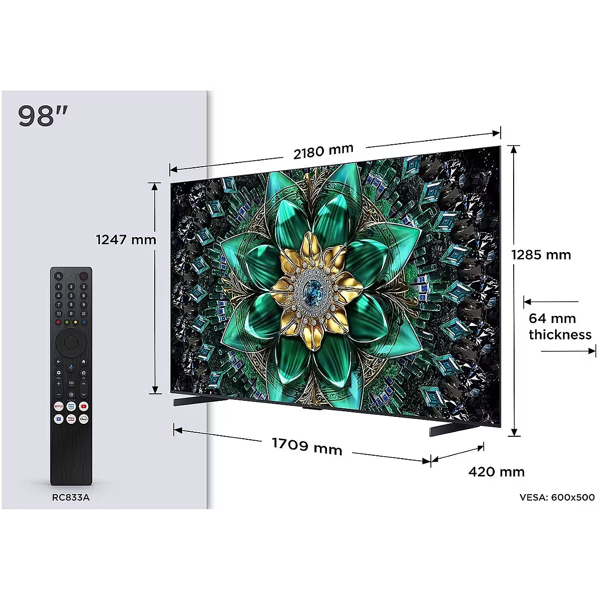 Summary - TCL Q6C 98Q6C. Display diagonal: 2.49 m (98"), Display resolution: 3840 x 2160 pixels, HD type: 4K Ultra HD, Display technology: QD-Mini LED, Screen shape: Flat. Smart TV. Motion interpolation technology: PPI (Picture Performance Index) 4100, Native aspect ratio: 16:9. Digital signal format system: DVB-C, DVB-S2, DVB-T2. Wi-Fi, Ethernet LAN. Product colour: Metallic