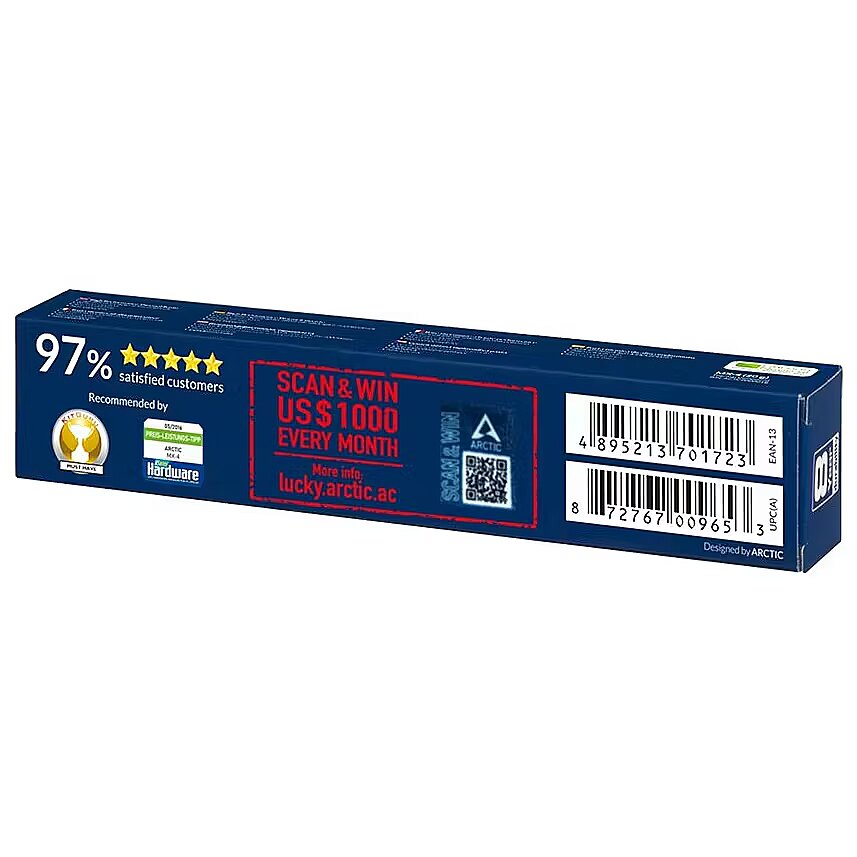 LongDesc - Optimised Packaging Saves ResourcesA sustainable use of resources is really important for us at ARCTIC Thus we updated the packaging of the MX-4 to minimize it's CO2 Footprint.The practical, recyclable packaging bag of our thermal compound helps us to reduce the environmental impact of packaging materials by about 40% and thereby save resources.Better than Liquid MetalThe ARCTIC MX-4 compound is composed of carbon micro-particles which lead to an extremely high thermal conductivity. It guarantees that heat generated from the CPU or GPU is dissipated quickly and efficiently. Superb in performance, MX-4 is the best companion for overclockers and enthusiasts.Easy to ApplyWith an ideal consistency, the MX-4 is very easy to use, even for beginners. The possibilities for its application and the most effectively way to avoid voids between CPU and cooler we show you in the video.Safe ApplicationIt does not contain any metallic particles so electical conductivity would not be an issue. Unlike silver and copper compound, it ensures that contact with any electrical pins would not result in damage of any sort.High DurabilityIn contrast to metal and silicon thermal compound, the performance of MX-4 does not compromise over time. Once applied, you do not need to apply it a second time as it will last at least for 8 years.Value for MoneyA high performance thermal compound perfect for system builders, there's no suprise that the MX-4 exceeds your expectations for its low price tag.