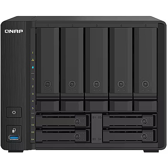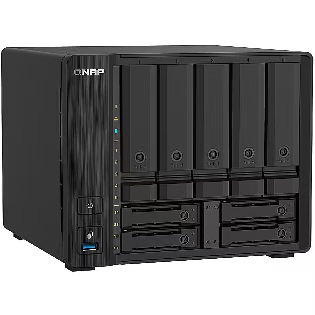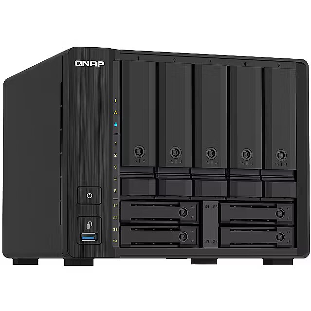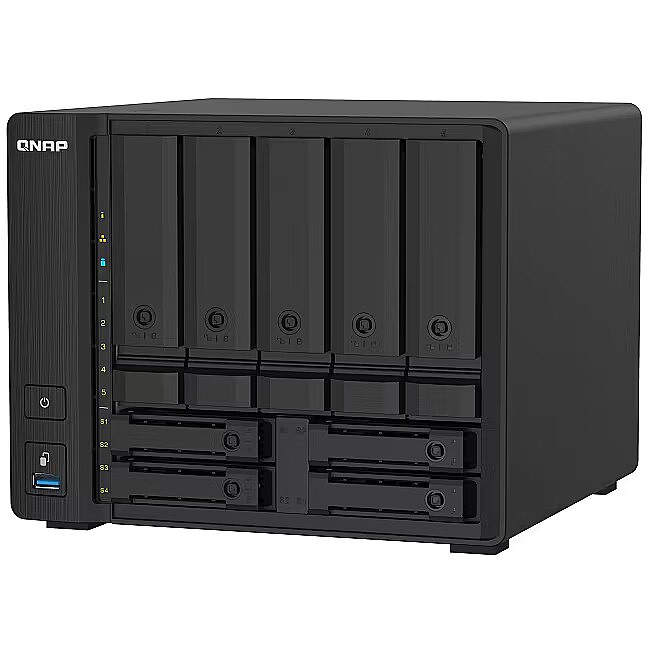 Description - QNAP TS-932PX The quad-core 1.7GHz TS-932PX fits nine drive bays into the size of a 5-bay NAS. With five 3.5-inch SATA 6Gb/s drive bays and four 2.5-inch SATA 6Gb/s bays, the TS-932PX provides the ability to create an HDD/SSD hybrid infrastructure to boost application performance. With two 10GbE SFP+ and two 2.5GbE LAN ports, the TS-932PX supports next-generation networks for empowering bandwidth-demanding applications and providing smoother file access and sharing. 1 Two 10GbE SFP+ and two 2.5GbE RJ45 network ports empower bandwidth-demanding tasks and accelerate file sharing. 2 HBS provides comprehensive backup and data recovery; QuDedup deduplicates the data at the source to optimize storage and bandwidth usage, while reducing backup times. 3 Snapshots record your system status, allowing you to protect files and data from accidental deletion and malware attacks. 4 Cloud storage gateways realize hybrid cloud applications by working with the cache space reserved on NAS to ensure low-latency data access to the cloud. 5 Qtier auto-tiering technology and SSD caching enable constant storage optimization. 6 Increase the storage capacity of the TS-932PX with QNAP TR RAID expansion enclosures or TL JBOD.