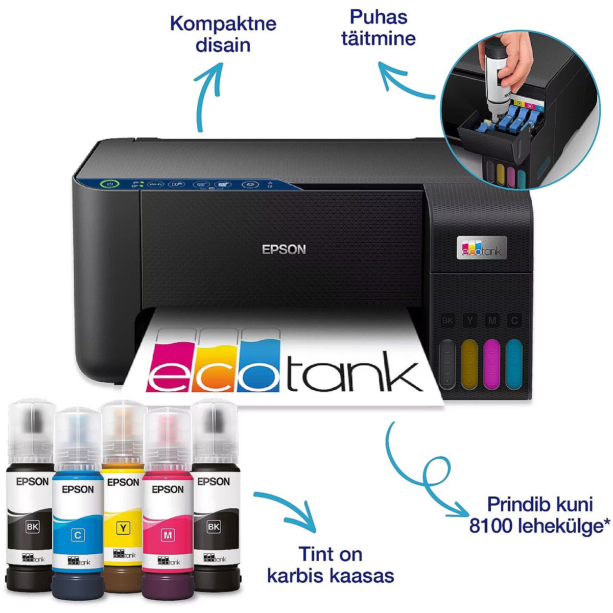 description_et - Stressivaba, mugav printimine kuni 66 kasseti väärtuses tindiga ühes pudelikomplektis – säästad taastäidetavate tindimahutitega printimiskuludelt kuni 90% A4 multifunktsionaalne printer – kõrge kvaliteediga printimine, paljundamine ja skannimine ühes masinas Juhtmevaba ühenduvus võimaldab printida kõikjalt – kasuta Epson Smart Panel rakendust, et printimist seadistada, jälgida, printida ja teha palju muud oma nutiseadmega Prindib kuni 8100 lehte musta tindiga ja 6500 lehte värvilise tindiga – kõik on karbis kaasas, lihtsalt lisa paberit Number 1 tindimahutiga printerimark kogu maailmas – 2023. märtsi seisuga on maailmas müüdud 80 miljonit EcoTanki printerit Lihtne probleemivaba tindimahutite süsteem võimaldab pudelitest uuesti täita. Lisaks tagab EcoTanki võtmelukuga pudelisüsteem, et protsess on määrimisvaba. Jäta kassettidega hüvasti