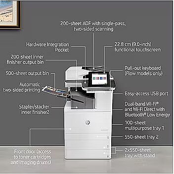 LongSummaryDescription - HP Color LaserJet Enterprise Flow MFP M776zs. Print technology: Laser, Printing: Colour printing, Maximum resolution: 1200 x 1200 DPI, Print speed (colour, normal quality, A4/US Letter): 46 ppm. Copying: Colour copying, Maximum copy resolution: 600 x 600 DPI. Scanning: Colour scanning, Optical scanning resolution: 600 x 600 DPI. Faxing: Colour faxing. Duplex functions: Print, Copy, Scan. Maximum ISO A-series paper size: A3. Wi-Fi. Direct printing. Product colour: Black, White