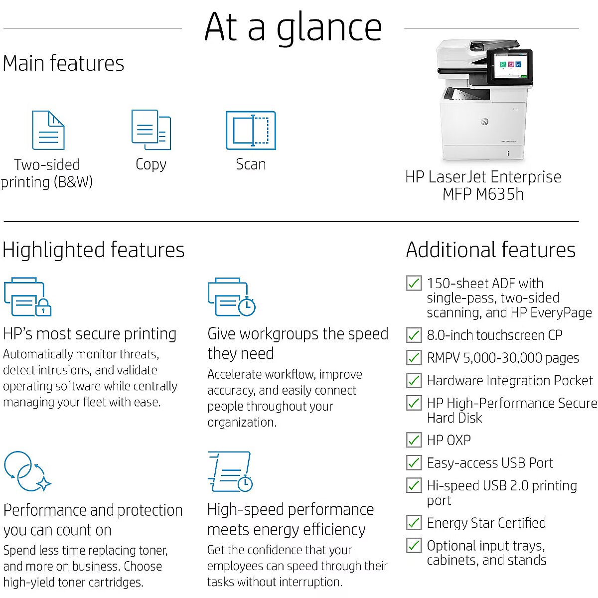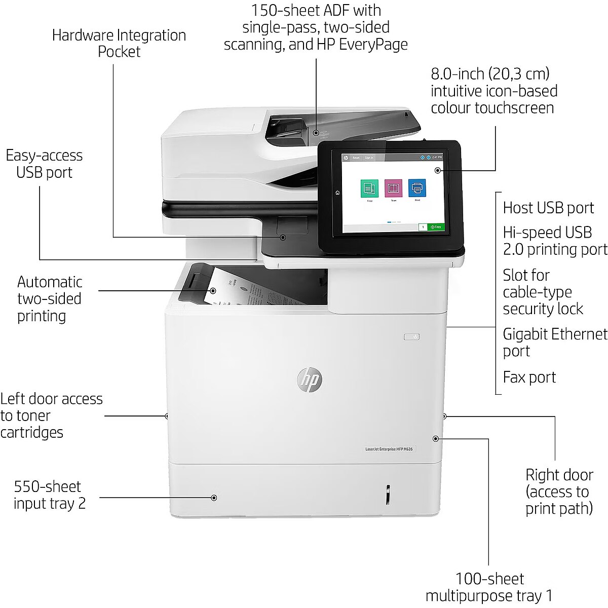 ShortSummaryDescription - HP LaserJet Enterprise MFP M635h, Laser, Mono printing, 1200 x 1200 DPI, Colour copying, A4, Black, White