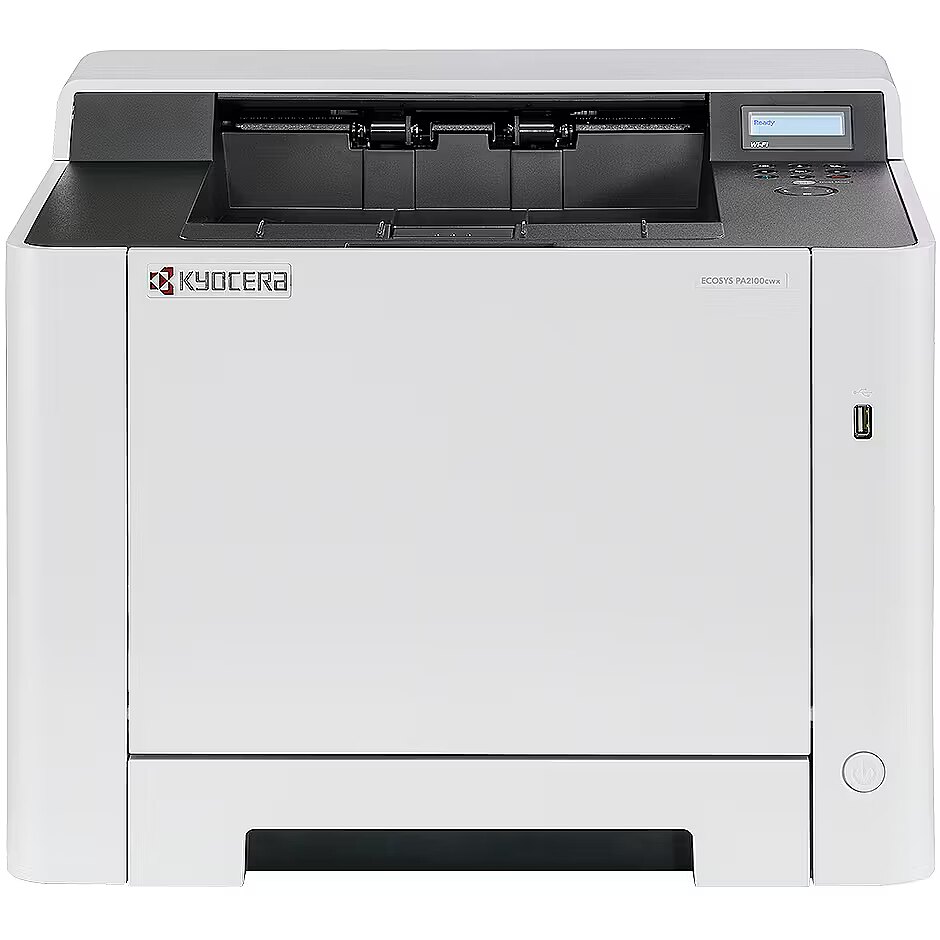 Technical_details - ECOSYS PA2100cwx, color laser printer Compact design, high performance: The ECOSYS PA2100cwx creates printouts with a resolution of up to 1200 x 1200 dpi. This color laser printer for the home office or small office works extremely efficiently at a speed of up to 21 pages per minute and can be integrated into existing work processes via LAN or WLAN. In addition, it has a wide range of security functions, a duplex unit for double-sided printing and can hold up to 300 sheets of paper. Type: Color Laser Printer Colour: grey/black EAN: 0632983074848 Manufacturer number: 110C093NL0 Series: ECOSYS PA Connections: 1x RJ-45, 1x USB-B 2.0, 1x USB host Communication: WiFi direct printing, WLAN Media: glossy paper, plain paper Emulations: PCL 6 (5c, XL), KPDL 3 (PostScript 3 compatible), PDF Direct Print 1.7, XPS/Open XPS Direct Print Operation: function keys Display: 2-line LCD, backlit Consumables: Toner: TK-5440K black (up to 2800 pages/ISO), TK-5430K black (up to 1250 pages/ISO), TK5440C cyan, TK-5440M magenta, TK5440Y yellow (each up to 2400 pages/ISO), TK5430C cyan, TK5430M magenta, TK5430Y yellow (each up to 1250 pages/ISO) Compatible: MacOS X, Windows 8, Windows 10, Windows 11, Windows 2012 Server, Windows 2016 Server, Windows 2019 Server Memory: occupied | 512MB Memory card reader: SD, SDHC Subjects: Paper | Tray 1: 250 sheets Subjects: Output | Tray 1: 150 sheets Subjects: Manual | Tray 1: 50 sheets Printer: Print Area | 210x297mm Printer: Resolution | color | 1200x1200dpi Printer: Resolution | Black | 1200x1200dpi Printer: Printing Technology | Kind | color laser printing Printer: Print Volume | one-off peak load | 65000 sheets Printer: Print Volume | maximum monthly utilization | 2000 sheets Printer: Speed | Black | Black (A4): 21 ppm Printer: Speed | color | Color (A4): 21 ppm Printer: Speed | reprints first page after | 12.5s Power supply: mains voltage | AC 220 - 240V (50Hz/60Hz) Power supply: energy consumption | Operation | 345 watts Power supply: energy consumption | Standby | 33 watts Feature: Duplex unit (printing), Apple AirPrint, Google Cloud Print, Processor: Cortex-A9 (800 Mhz). Printing functions: Proof and hold, N-up printing (printing multiple pages on one sheet), Internet printing IPP 1.0, e-mail printing, WSD print, toner save mode. "Confidential Print" with PIN code request, Encrypted PDF Direct Printing, security watermark, IPSec, HTTPS, SNMPv3, TLS 1.2, user group restriction by User login management2, IP filter, port number restriction, interface blocking, integrated cost management for up to 20 cost centers. Media weights supported: 60 – 220 gsm. Adjustable media sizes: 70mm x 148mm - 216mm x 356mm). Accessories: available | Toner for up to 1500 pages (ISO) in black, cyan, magenta and yellow, quick start guide, safety instructions, power cable Dimensions: device | Width: 410mm x Height: 329mm x Depth/Length: 410mm Weight: 21kg