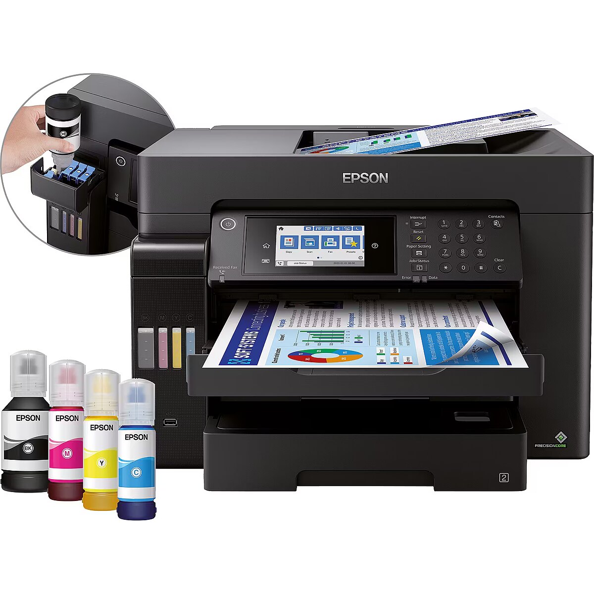 LongDesc - High performance printingA3+ print, scan, copy and fax with this fast, feature-rich EcoTank. It offers a low cost per page, 550-sheet tray capacity and 50-sheet ADF.This feature-rich EcoTank makes light of A3+ tasks, while offering a low cost per page. A3+ jobs can be accomplished quickly thanks to fast print and scan speeds, two 250-sheet front trays, a 50-sheet rear feed, and a 50-sheet A3 ADF. Print how you like with mobile printing, Ethernet and a 10.9cm LCD touchscreen with hard keys.Get more done in less timeGet the edge with this fast and efficient printer that can deliver a first page in as little as 5½ seconds. Coupled with fast double-sided printing, and a high speed Automatic Document Feeder, you’ll be able to speed through everyday tasks.Feature-rich A3 EcoTankThe ET-16650 is designed for A3 tasks with A3+ print, scan, copy and fax. It's easy to navigate the extensive range of features via the 10.9cm LCD touchscreen and hard keys.Keep on savingSave every time you print with this EcoTank that delivers an incredibly low cost per page. Unlike other printers, EcoTank features large ink tanks that you fill with low-cost ink bottles.End interuptionsMinimising refills, this EcoTank can print thousands of pages before needing more ink, while the two A3 paper trays offer a capacity of 500-sheets. Free yourself from manual page loading with a generous 50-sheet rear feed and A3 ADF.Print from almost anywhereIt's easy to print from mobiles, tablets and laptops using EcoTank. With Wi-Fi and Wi-Fi Direct, you can send documents to print from smart devices using the Epson iPrint app.Easy to use and reliableFilling the large front ink tanks is simple with the resealable, intuitive and drip-free ink bottles.The heat- free PrecisionCore printhead is renowned for its speed, quality, reliability and efficiency, and will last the lifetime of the printer.