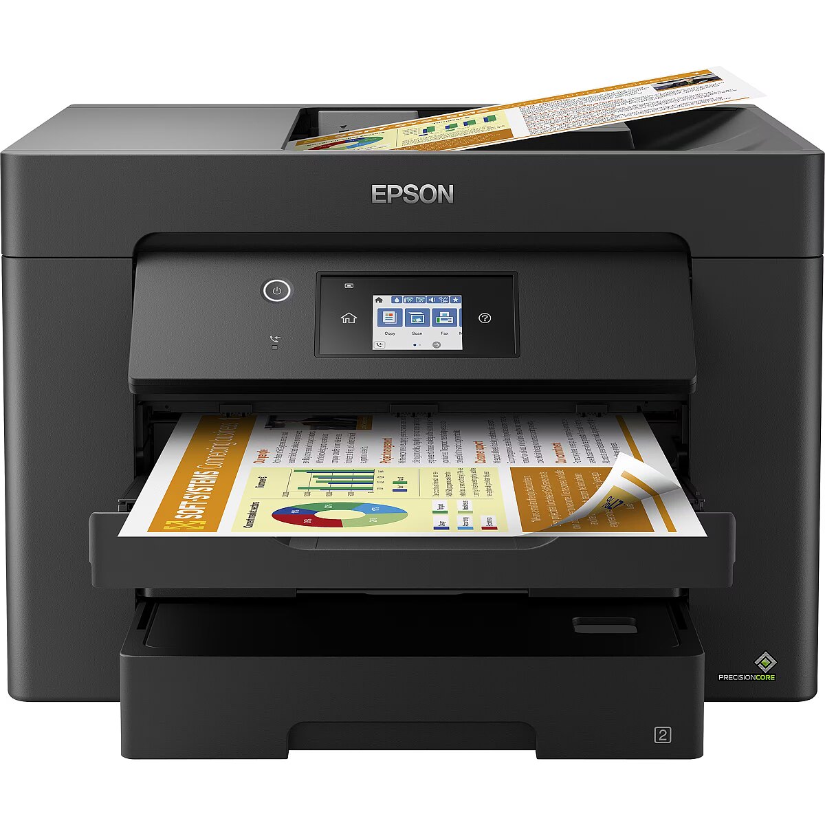 LongDesc - Think big with this high-quality multifunction with single and double-sided printing, scanning and fax all up to A3. You’ll stride through tasks with print speeds of up to 25ppm¹ in black and a 50 page A3 automatic document feeder (ADF). And that’s not forgetting its cost-effective inks and flexible wireless connectivity solutions such as Scan-to-cloud.Professional A3 printingThis A3 multifunction printer will meet the needs of even the most demanding home office and small office users. It offers double-sided (duplex) printing, scanning and faxing all up to A3, plus its automatic document feeder can process up to 50 double-sided A3 pages. Furthermore, its PrecisionCore printhead produces high-quality, laser-like prints.Enhance your productivityThis efficient, reliable and fast model offers A3 double-sided printing and print speeds of 25ppm in black and 12ppm in colour¹. It’s also simple to operate directly thanks to its intuitive user interface and 6.8cm touchscreen.Minimise your outgoingsDramatically reduce your costs; this printer is compatible with individual inks which are are 50% more efficient compared to tri-colour cartridges³. Giving great value for money, cartridges are available in standard, XL and XXL, with the highest yield delivering up to 1,100 pages.Flexible wireless solutionsPrint from anywhere in the office with Wi-Fi connectivity or use Wi-Fi Direct to print from compatible wireless devices without a Wi-Fi network. Epson's free mobile printing apps and solutions provide further versatility; Email Print allows you to send items to print from almost anywhere in the world. And with Scan-to-Cloud, you can enjoy the benefits of collaborative working.- High-quality A3 multifunction: Double-sided print, scan, copy and fax - all up to A3- Fast business-quality printing: 25ppm in black and 12ppm in colour- Cost-effective inks: Individual inks are 50% more efficient compared to tri-colour cartridges- Wireless solutions: Ethernet, Wi-Fi, Wi-Fi Direct and Scan-to-Cloud- Epson's free mobile printing apps: Freedom to print and scan from almost anywhere