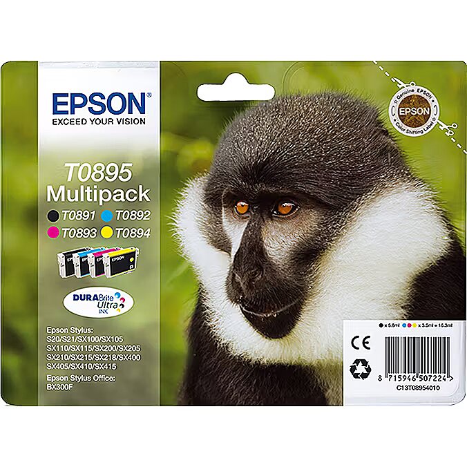 LongSummaryDescription - Epson Monkey Multipack 4-colours T0895 DURABrite Ultra Ink. Black ink volume: 5.8 ml, Supply type: Multi pack, Colour ink volume: 3.5 ml, Printing colours: Black, Cyan, Magenta, Yellow, Quantity per pack: 1 pc(s)