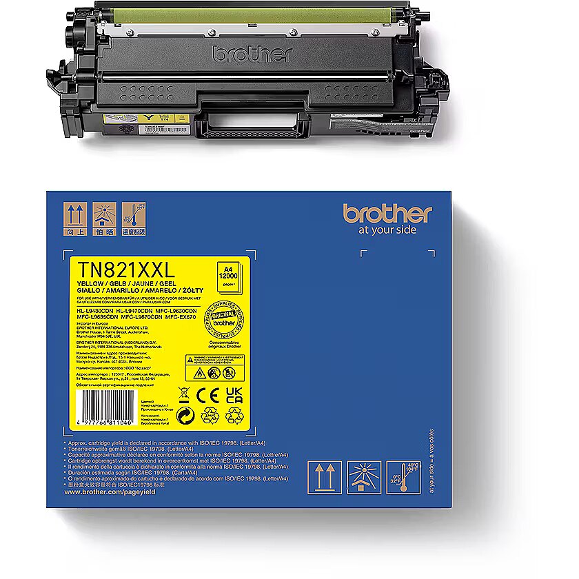 LongDesc - - Prints up to 12,000 pages in accordance with ISO/IEC 19798- High quality genuine Brother Yellow super high yield toner cartridge TN821XXLY- Genuine Brother toner cartridges are rigorously tested to print perfectly every time saving you time and money- Using this Brother TN821XXLY super high yield original laser toner cartridge protects your printer warrantyThis genuine replacement TN821XXLY yellow super high yield toner cartridge, is design to produce crisp clear print outs, time and time again. Compatible with a range of printers, our easy to install cartridges will help you produce long-lasting documents that won’t smudge or fade over time. Brother consider the environmental impact at every stage of your toner cartridge life cycle, reducing waste at landfill. All our hardware and toner cartridges are built to have as little impact on the environment as possible. Genuine Brother TN821XXLY Laser toner cartridge - worth it every time. Higher print volumeHigh yield cartridges contain more toner for a higher page yield and lower cost per page. For those with high volume print needs they save you time by reducing the frequency of cartridge changes.Reliability and Quality AssuranceBrother genuine toner is specially formulated to maximise print quality, performance and reliability. Each Brother laser printer is designed to work at pre-set temperatures that are matched exactly to each individual toner formulation to ensure seamless print quality and reliability.Guaranteed to WorkBrother toner cartridges are designed as an entire printing system with Brother printing devices in mind - to provide a superior degree of quality. Genuine Brother toner supplies are the best way to protect your investment and ensure optimal performance from your Brother laser printer, guaranteeing you effortless performance and saving you money in the long run.Performance TestedEach toner cartridge is rigorously print tested to ISO standards in order that every user can be assured of the quality and performance they expect. Get a truly professional finish with Brother genuine laser supplies.Support ‘at your side’Using Brother genuine supplies protects your printer warranty. Brother are always "at your side". We commit to providing excellent sales support and customer care - both before and after purchase. Environmental and RecyclingOur world class toner remanufacturing programme helps to reduce waste extending our product lifecycle and reducing environmental impacts.laser genuineCheck the authenticity of your suppliesYou will find the holographic security label on Brother genuine toner cartridges. Ensure the package and security label has not been tampered with and confirm the hologram security label is genuine by verifying the unique 7-digit ID No. at: www.brother.com/id