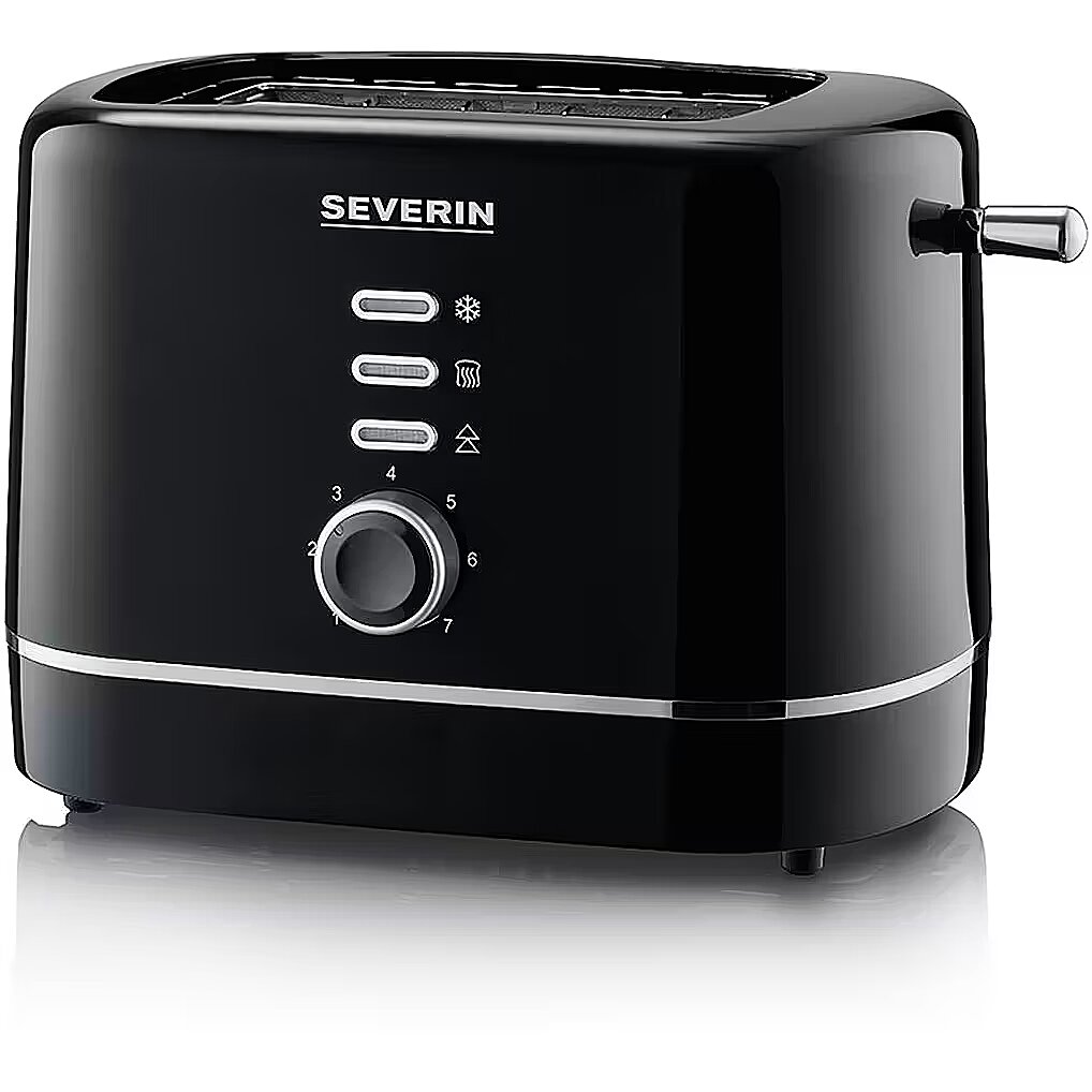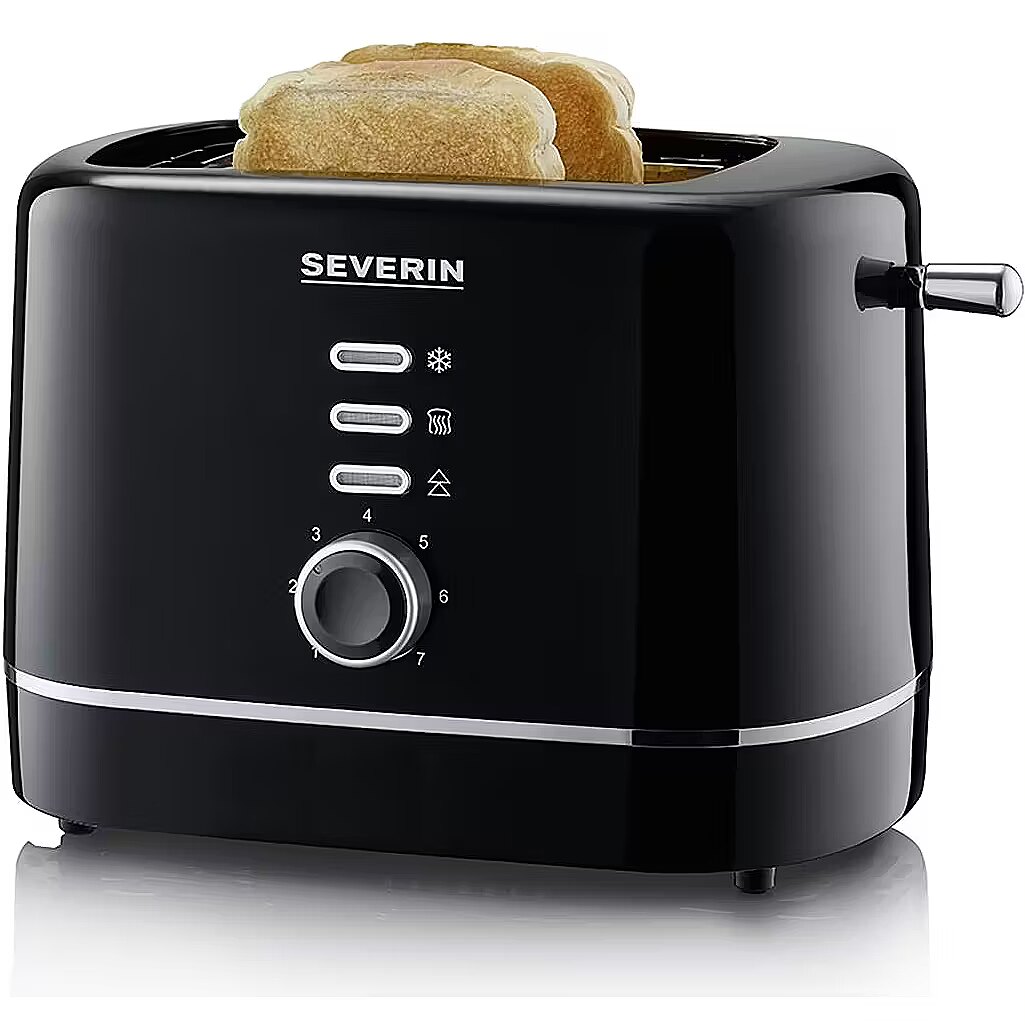 MediumDescription EN - The Severin toaster with 850 W power ensures evenly golden-brown toast every time, thanks to its automatic slice centering feature. The toaster is equipped with defrost and reheat functions, along with a separate cancel button for full control. If a slice gets stuck, the toaster automatically shuts off. The adjustable browning level allows you to achieve the exact desired result. Additionally, the toaster features a removable crumb tray for easy cleaning and an integrated cord storage for compact storage. • Slice centering: Even browning on both sides