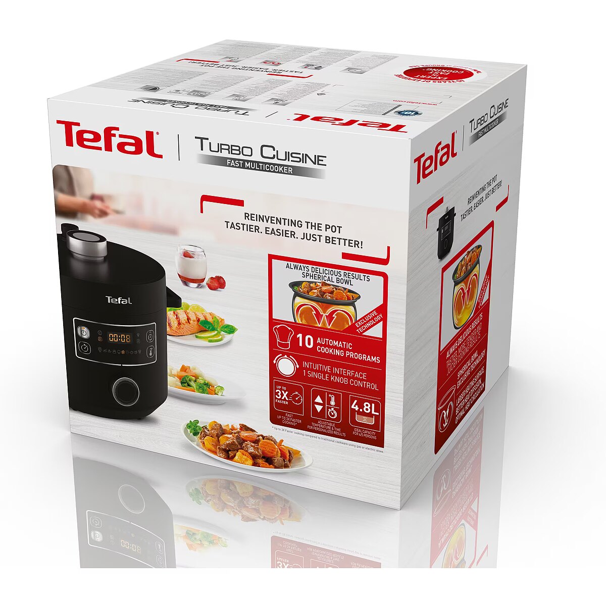 MediumDescription EN - Tastier, easier and faster: The multicooker reinvented Your brand new solution for delicious meals in no time: With the TURBO CUISINE Fast Multicooker, Tefal makes mouth-watering home cooking easier than ever. Whip up delicious, wholesome meals for the entire family with effortless automatic programs from starter to dessert and a pressure cooker mode for perfect results up to 3x faster*. Tefal's exclusive spherical bowl technology ensures tender and juicy results, with an intuitive single control knob for a user-friendly appliance.