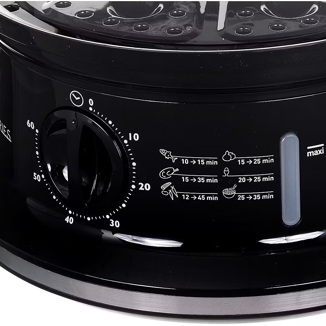 Technical Specifications: Power: 900 W Number of baskets: 2 Total capacity: 6 L Timer: Mechanical (up to 60 min) with automatic shut-off Control type: Rotary Water level indicator: Yes Dishwasher-safe removable parts Features: Visible water level, easy filling during cooking, cord storage Appliance placement: Freestanding Colour: Black Approximate dimensions (W × D × H): ~300 × 295 × 236 mm Net weight: ~2.1 kg Gross weight (boxed): ~2.45 kg