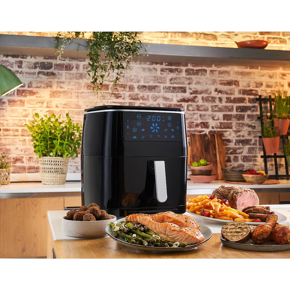 Intuitiivne digitaalne juhtpaneel koos 60-minutilise taimeriga ja automaatse väljalülitusfunktsiooniga pakub täielikku mugavust. Tänu patenteeritud korvisüsteemile saad resti eemaldada. See aitab tervislikumate retseptide jaoks õli põhjast kinni püüda, lihtsasti puhastatav korv.