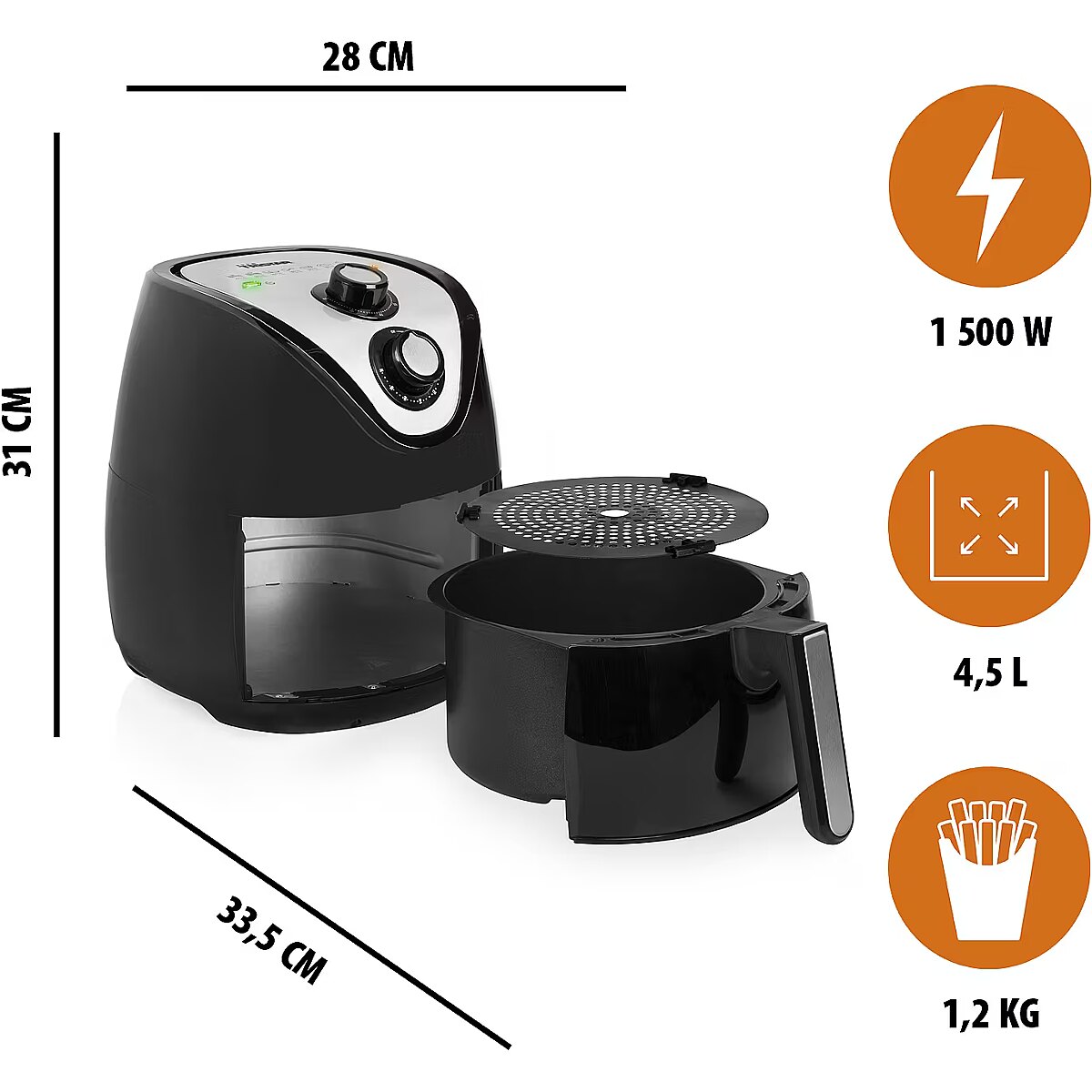 LongSummaryDescription - Tristar FR-6994 Crispy Fryer XXL. Product type: Hot air fryer, Capacity: 4.5 L, Temperature (min): 80 °C. Construction type: Single, Product colour: Black, Silver, Appliance placement: Stand-alone. Power: 1500 W, Power plug type: Type F. Weight: 5 kg. Package width: 320 mm, Package depth: 320 mm, Package height: 340 mm