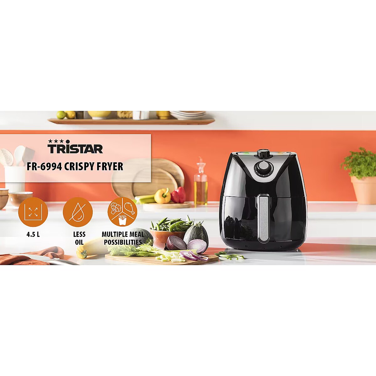 LongDesc - The Tristar FR-6994 Crispy Fryer XXL has a volume of no less than 4.5 litres. Therefore, the air fryer has enough capacity to make fries for the whole family in one batch. You do not have to add oil, which makes it more healthy. Furthermore, the Crispy Fryer XXL is also suitable for baking, grilling or roasting all kinds of dishes.Great resultsThe Tristar Crispy Fryer XXL has an extra large capacity with which you can bake up to 1 kilogram of fries in one batch, more than enough for the whole family. Thanks to the high speed air convection, you will have the most crunchy results without using oil or just a little bit. Therefore, the fries are less fat and more healthy. But there is more: you can also use the crispy fryer to bake, grill or roast. This allows you to easily prepare vegetables, meat and fish in the air fryer, but also cakes or pies.Ease of useThe control of the Tristar Crispy Fryer is very easy thanks to the analogue control panel. By means of two turning dials for time and for temperature, you can always find the right settings for your dish. The temperature can be set from 80⁰C to 200⁰C and the timer with alarm can be set up to 30 minutes. The fryer will reach the right temperature quickly, thanks to the 1800 Watt power.Easy to cleanThe Tristar Crispy Fryer XXL is provided with a non-stick coating for extra ease of use and lower maintenance. Moreover, the non-stick coated inner pan and removable basket make the air fryer very easy to clean.Safe to useThe FR-6994 Crispy Fryer XXL is safe to use. The air fryer is provided with overheat protection so you will not have to worry about overheating of the fryer. You can always safely touch the basket, thanks to the cool touch handle. Finally, the crispy fryer will always stand firmly on your countertop thanks to the non-slip feet.What’s in the box?Tristar Crispy Fryer XXL, removable basket, instruction manual