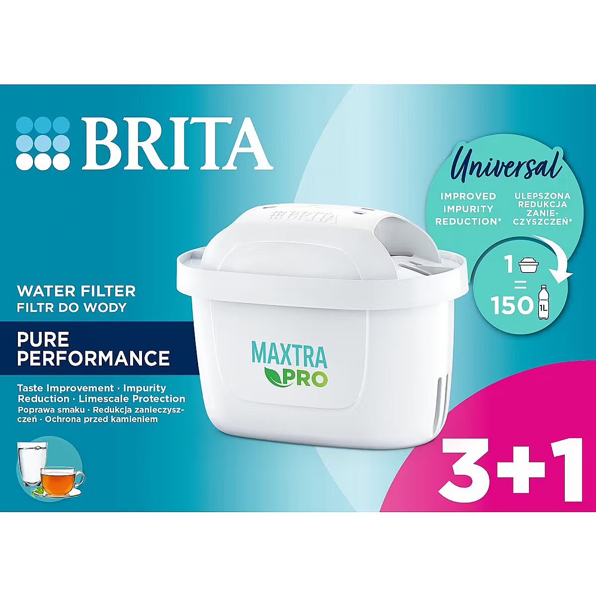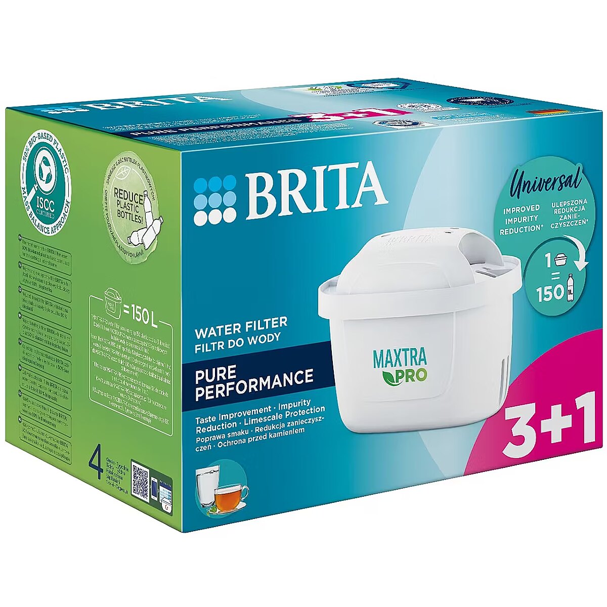 Description - Maxtra PRO Pure Performance replacement cartridge 3+1 piece The perfect solution for cold water lovers BRITA MAXTRA PRO Pure Performance filter cartridges are designed mainly for filtering soft and medium-hard water. With this filter, you will forget about carrying heavy packs of bottled water. Filtered tap water is not only cleaner - it costs only a few groszy per liter! With them, taking care of proper hydration will become even easier! The BRITA MAXTRA PRO Pure Performance filter cartridge is cleaner water with an excellent taste, available whenever you want it. The water filter fits all BRITA jugs from the Aluna, Style, Marella, Elemaris, Flow series and the Glass glass jug. See how much you can gain thanks to the highest quality BRITA MAXTRA PRO Pure Performance cartridges: Cleaner, clearer water with a better taste. The perfect source of hydration for cold water lovers Big savings: a liter of filtered water costs only a few cents. Healthier and fresher water for up to 4 weeks with one filter, now the filter capacity is 150 l. Increased filtration capacity up to 150 l. 1 MAXTRA PRO filter replaces 150 disposable, plastic water bottles (with a capacity of 1 l). The most ecological filter in the history of BRITA. 50% bioplastic was used to make the cover and housing. Biological plastics are produced in whole or in part from renewable, biological sources such as plants. Only bioplastic is used, which has been certified by the internationally recognized organization ISCC PLUS. How does the BRITA MAXTRA PRO Pure Performance filter work? Filtration through the BRITA MAXTRA PRO Pure Performance is a 4-stage process: Super fine mesh: captures large particles from old water pipes, e.g. sand or rust. Natural activated carbon beads, made from coconuts, will prevent chlorine and its derivatives from getting into the filtered water, as well as trace contaminants such as herbicides, pesticides and pharmaceutical residues (if present in tap water) Ion exchanger beads reduce metals: e.g. lead and copper and soften water (hardness reduction has been tested up to 120 l). An additional high-efficiency filter mesh means 4x better impurity retention compared to the previous MAXTRA+ filter (particle size 30 micrometers) Safety included All BRITA products, including filter jugs, have received a positive Hygiene Certificate from the National Institute of Public Health and Hygiene. Thanks to the fact that they have been thoroughly tested, you can be sure that you are using safe water filters. BRITA MAXTRA PRO filters mean less plastic waste By choosing BRITA MAXTRA PRO filter jugs and cartridges, you are protecting our planet. By drinking filtered tap water, you are not only taking care of your health and the health of your family, but also reducing the amount of single-use plastic. Less plastic waste means more benefits for our environment. Give new life to used BRITA filters To protect the environment even better, BRITA Polska is running an innovative program, thanks to which used water filters can be recycled. This is another pro-ecological step in which you can participate - join the #RecyklingzBRITA club. Collect 6 used cartridges (BRITA MAXTRA+ or MicroDisc) and send them to BRITA Polska. You will not only receive a new cartridge in return, but you will also help protect our planet. You can learn more about this program at brita.pl Give BRITA filters a second life!