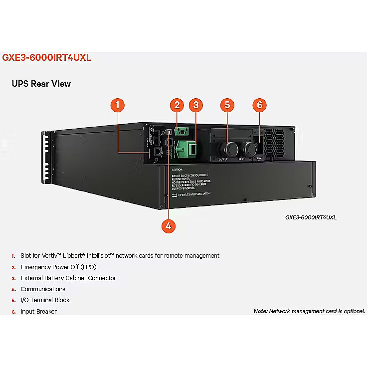 Description - The Vertiv Liebert GXE UPS is a cost-effective and efficient online double-conversion solution that provides power protection and deployment and operational flexibility. The unit output power factor (1.0) of the Liebert GXE single-phase UPS provides continuous and reliable power to a larger number of connected devices, protecting them from multiple AC mains disturbances thanks to online double conversion technology and input surge protection. The high performance of the mains operation and eco mode of the economical UPS also provides energy and operating cost savings. Available in 6 or 10 kVA power ratings, it provides the flexibility to be installed in both stand-alone and rack-mounted versions, along with mission-critical IT equipment for any application. In addition, the ability to expand with external battery enclosures provides scalable back-up time for applications requiring extended back-up time in the event of AC mains failure. In addition to extended battery runtime, the unit is equipped with multiple monitoring options, making the compact UPS provide best-in-class power protection for equipment deployed at the network edge or at remote sites.