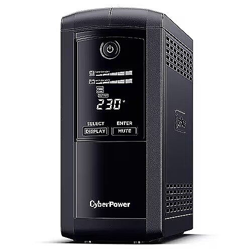 Description - VP700ELCD-FR UPS. The CyberPower VP700ELCD-FR offers home and office users reliable battery backup and protects office computers and other electronic devices from surges, power spikes, power outages and other power-related incidents. Designed with GreenPower UPS technology to improve operational efficiency and minimise energy consumption, users can enjoy significant energy cost savings over traditional UPS systems. The UPS provides automatic voltage regulation (AVR) to maintain a safe voltage for connected equipment. The UPS has a multifunctional LCD screen displaying power parameters and battery status. The product has high-bandwidth network port protection to protect connected telephones, network and communication devices from surges / spikes, and provides 1Gbps bandwidth for data transfer. The UPS is also compatible with PowerPanel power management software for real-time monitoring and configuration. Line-interactive UPS topology Simulated sinusoidal output voltage LCD status display USB connectivity port Serial communication port Energy Saving Technology Automatic voltage regulation (AVR) High-speed Ethernet data transmission Interference and surge protection PowerPanel management software