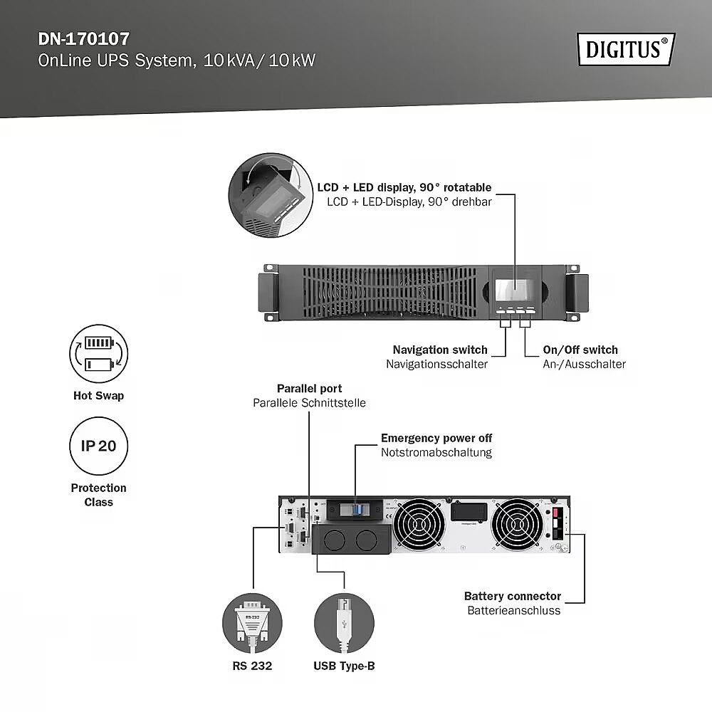 Description - Systemy UPS DIGITUS OnLine to niezawodne rozwiązania, które zostały opracowane z myślą o ochronie wrażliwych urządzeń w zastosowaniach przemysłowych przed przerwami w dopływie prądu. Są one wyposażone w mikroprocesory sterujące dla zagwarantowania najwyższej wydajności i bezpieczeństwa. Można równolegle podłączyć maks. 4 urządzenia, aby zwiększyć redundancję w zakresie zasilania energią elektryczną. UPS nie posiada wewnętrznych baterii, należy je zamówić oddzielnie jako zewnętrzne moduły bateryjne (numer artykułu: DN-170108). Można podłączyć maksymalnie 4 zewnętrzne moduły bateryjne. Dzięki wysokiemu współczynnikowi mocy, szerokiemu zakresowi napięcia wejściowego oraz wydajnej ładowarce system spełnia najwyższe wymagania. Inteligentne tryby ładowania i sterowania prędkością obrotową wentylatorów wydłużają żywotność i niezawodność UPS. Za pomocą wyświetlacza LCD można skonfigurować wszystkie ustawienia parametrów tego zasilacza awaryjnego, dzięki czemu UPS firmy DIGITUS jest cennym rozszerzeniem Twojej infrastruktury IT. Adapter SNMP do zdalnego dostępu do systemu UPS jest dostępny opcjonalnie. Podwójna konwersja online (sterowana mikroprocesorem) Równoległa redundancja N+X Różnorodne wbudowane interfejsy do komunikacji (RS232/USB, złącze szeregowe, slot na karty SNMP) Wariant z możliwością przekształcenia w konstrukcję Rack/Tower Zintegrowana wydajna ładowarka z 3-stopniową regulacją prędkości obrotowej wentylatorów Regulowany prąd ładowania Obsługiwany rozruch na zimno Temperatura robocza: od 0°C do 40°C i 12% na 5°C (maks. 50°C) 3-stopniowa regulacja prędkości obrotowej wentylatorów według procentowego współczynnika obciążenia i temperatury radiatorów Hot-swap: możliwa wymiana baterii w trakcie pracy Obrotowy ekran LCD z wielofunkcyjną regulacją parametrów i schematem funkcji Dostępna opcjonalnie karta SNMP umożliwia sterowanie zdalne za pośrednictwem sieci LAN