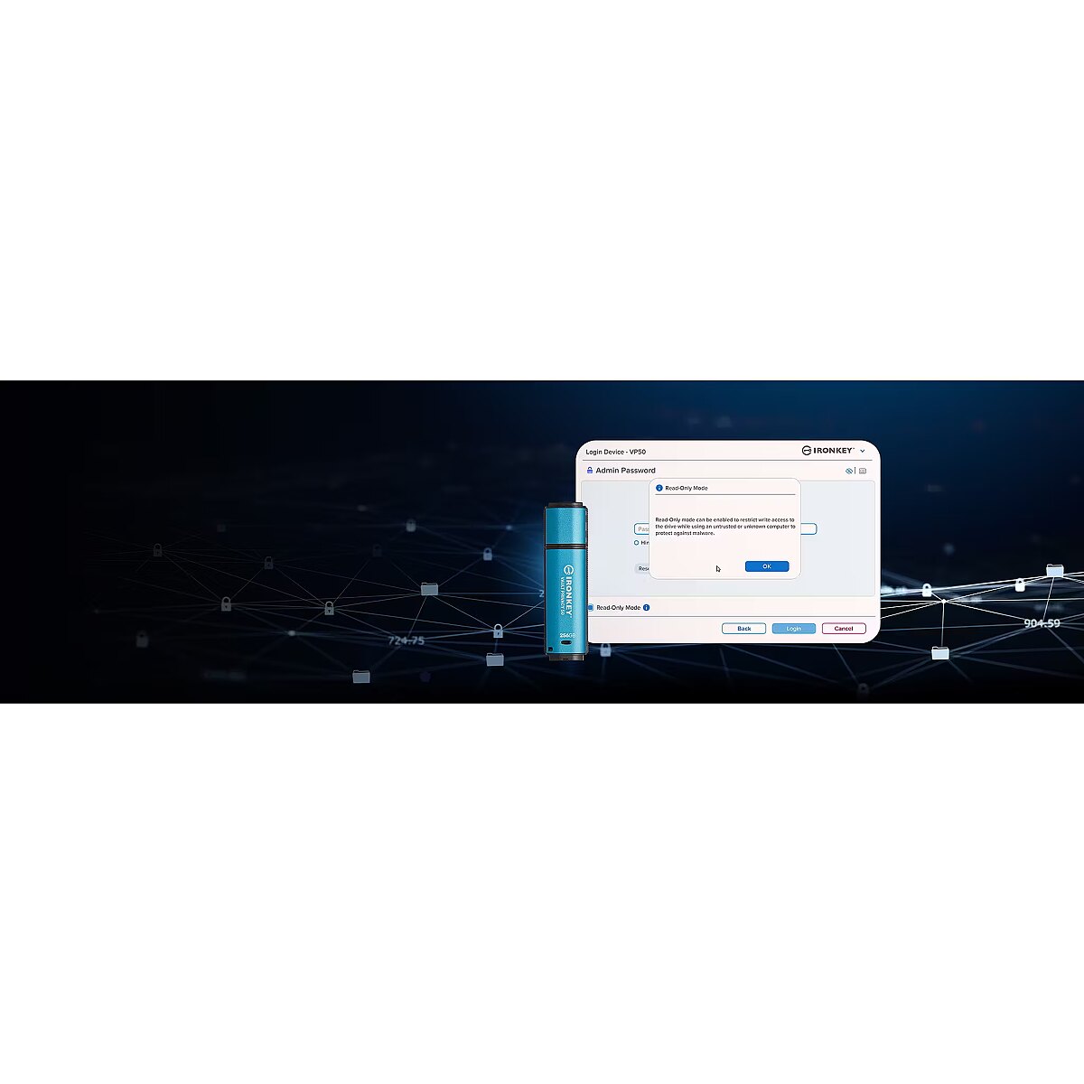 LongDesc - Kingston IronKey™ Vault Privacy 50 series are premium USB Type-A and USB Type-C®* drives that provide enterprise-grade security with FIPS 197 certified AES 256-bit hardware-encryption in XTS mode, including safeguards against BadUSB with digitally-signed firmware and against brute force password attacks. VP50 has been penetration tested***** (pen tested) for enterprise-grade security. Because it provides encrypted storage under the user’s physical control, the VP50 series is superior to using the internet and Cloud services to safeguard data.Vault Privacy 50 supports multi-password options (Admin, User and One-Time Recovery) with Complex or Passphrase modes. This enhances the ability to recover access to the data if one of the passwords is forgotten. Traditional Complex mode allows for passwords from 6-16 characters using 3 out of 4 character sets. The new Passphrase mode allows for a numeric PIN, sentence, list of words or even lyrics from 10 to 64 characters long. Admin can enable a User and a One-Time Recovery password, or reset the User password to restore data access. To aid in password entry, the “eye” symbol can be enabled to reveal the typed-in password, reducing typos that lead to failed login attempts. Brute force attack protection locks out User or One-Time Recovery passwords if 10 invalid passwords are entered in a row, and crypto-erases the drive if the Admin password is entered incorrectly 10 times in a row.To protect against potential malware on untrusted systems, both Admin and User can set Read-Only mode to write-protect the drive; additionally, the built-in virtual keyboard shields passwords from keyloggers or screenloggers.Organisations can customise and configure VP50 series drives with a product ID (PID) for integration with standard endpoint management software to meet corporate IT and cybersecurity requirement through Kingston’s Customisation Programme.Small and medium businesses can use the Admin role to manage their drives locally, e.g. use admin to configure or reset employee User or One-Time Recovery Passwords, recover data access on locked drives and comply with laws and regulations when forensics are required.Vault Privacy 50 offers fast dual-channel performance on all capacities. The drive is waterproof with IPX8 rating****, TAA compliant and assembled in the USA.Hardware-encrypted USB drive for data protectionSafeguard important data with FIPS 197 certified XTS-AES 256-bit encryption. Built-in protections against BadUSB, brute force attacks and pen tested for enterprise-grade security.Multi-password option for data recoveryEnable Admin, User and One-Time Recovery passwords. Admin can reset a User password and create a One-Time Recovery password to restore User’s access to data. Brute force attack protection locks out User or One-Time Recovery passwords if 10 invalid passwords are entered in a row, and crypto-erases the drive if the Admin password is entered incorrectly 10 times in a row.New Passphrase modeSelect between Complex or Passphrase password mode. Passphrases can be a numeric PIN, sentence with space characters, list of words or even lyrics – from 10 to 64 characters long.Dual read-only (write-protect) settingsAvoid malware attacks with a forced Read-Only mode set by Admin for User, or a session-based Read-Only mode set by Admin or User.Locally manage drives for small and medium businessesUse Admin role to locally manage employee User and One-Time Recovery passwords, recover data access on locked drives, and comply with laws and regulations when forensics are required.Additional security featuresReduce failed login attempts and frustration by enabling “eye” button to view the password typed. Use virtual keyboard to shield password entry from keyloggers and screenloggers.