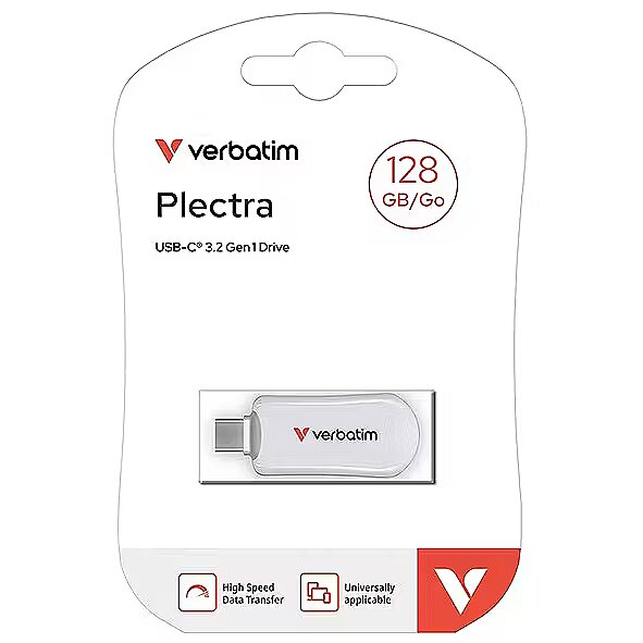LongSummaryDescription - Verbatim Plectra USB-C Flash Drive White 128GB. Capacity: 128 GB, Device interface: USB Type-C, USB version: 3.2 Gen 1 (3.1 Gen 1), Read speed: 100 MB/s, Write speed: 25 MB/s. Form factor: Capless. Weight: 8.5 g. Product colour: White