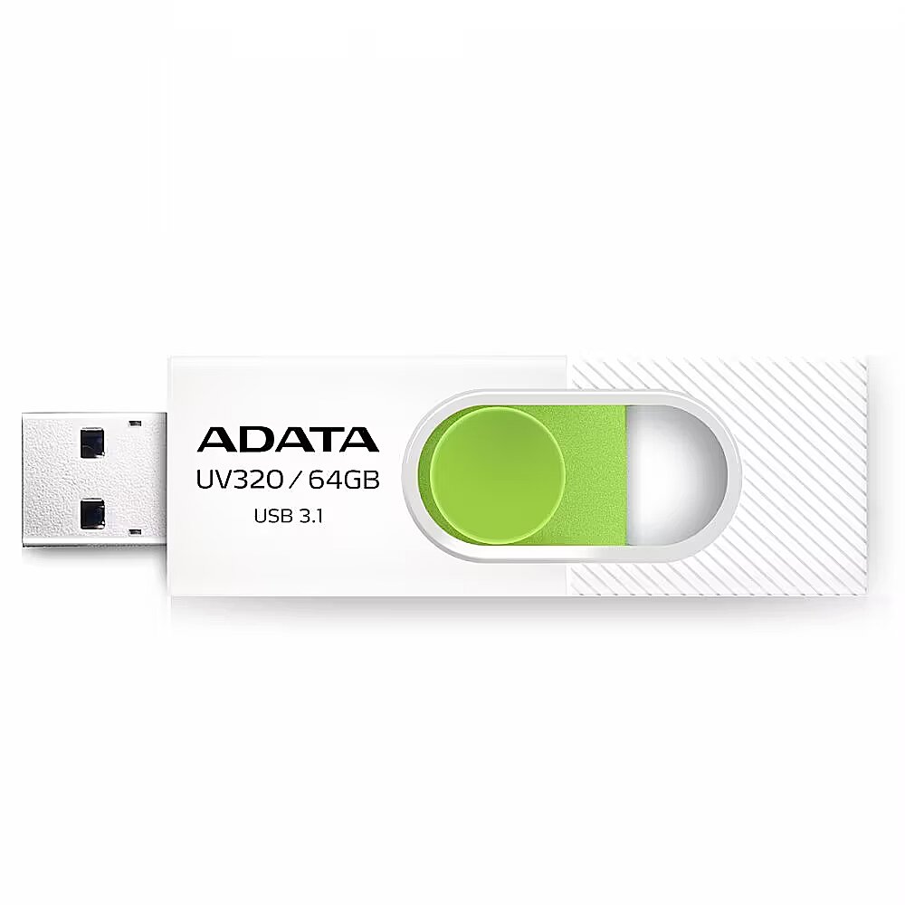 LongSummaryDescription - ADATA UV320. Capacity: 64 GB, Device interface: USB Type-A, USB version: 3.2 Gen 1 (3.1 Gen 1). Form factor: Slide. Weight: 7.9 g. Product colour: Green, White