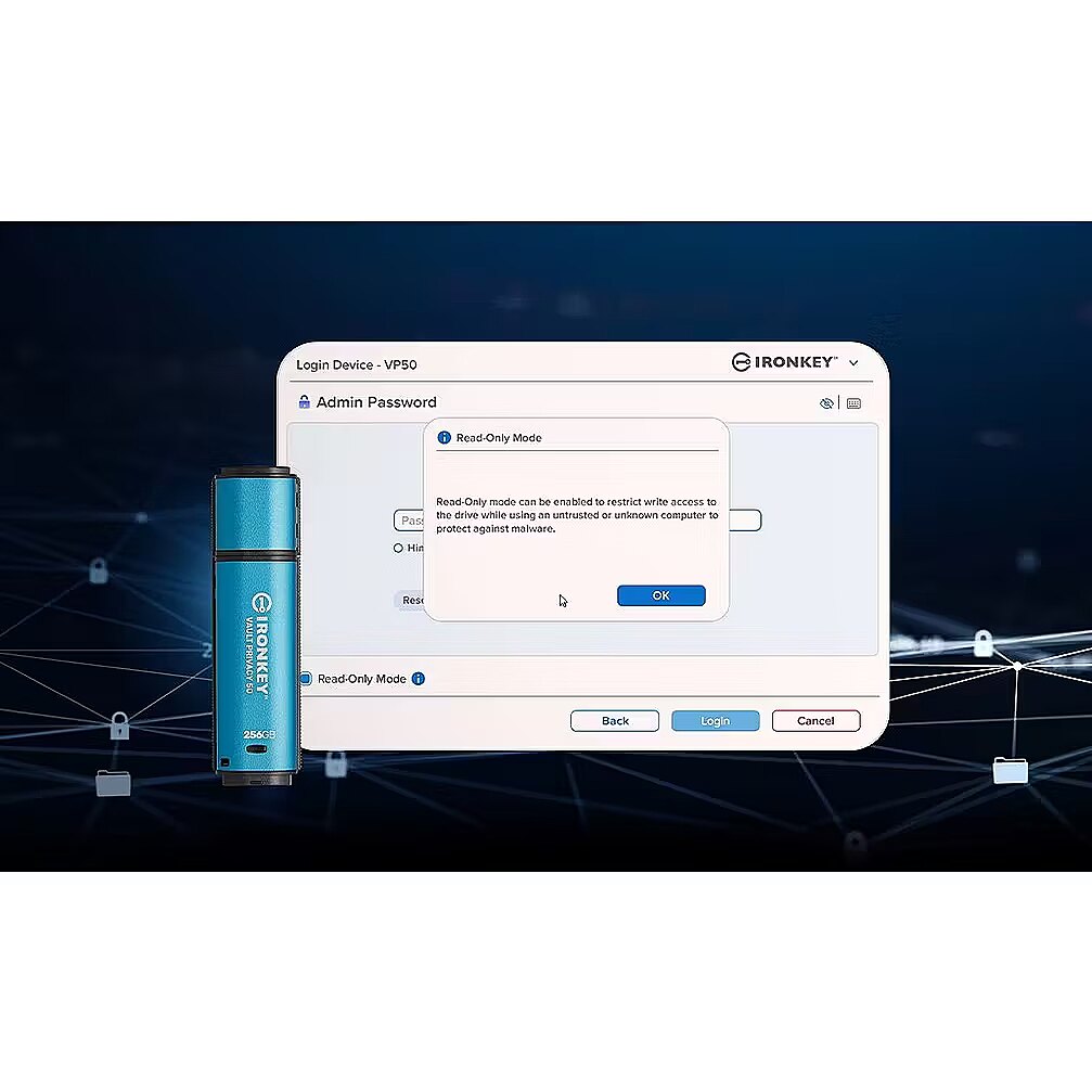 LongDesc - Kingston IronKey™ Vault Privacy 50 series are premium USB Type-A and USB Type-C®* drives that provide enterprise-grade security with FIPS 197 certified AES 256-bit hardware-encryption in XTS mode, including safeguards against BadUSB with digitally-signed firmware and against brute force password attacks. VP50 has been penetration tested***** (pen tested) for enterprise-grade security. Because it provides encrypted storage under the user’s physical control, the VP50 series is superior to using the internet and Cloud services to safeguard data.Vault Privacy 50 supports multi-password options (Admin, User and One-Time Recovery) with Complex or Passphrase modes. This enhances the ability to recover access to the data if one of the passwords is forgotten. Traditional Complex mode allows for passwords from 6-16 characters using 3 out of 4 character sets. The new Passphrase mode allows for a numeric PIN, sentence, list of words or even lyrics from 10 to 64 characters long. Admin can enable a User and a One-Time Recovery password, or reset the User password to restore data access. To aid in password entry, the “eye” symbol can be enabled to reveal the typed-in password, reducing typos that lead to failed login attempts. Brute force attack protection locks out User or One-Time Recovery passwords if 10 invalid passwords are entered in a row, and crypto-erases the drive if the Admin password is entered incorrectly 10 times in a row.To protect against potential malware on untrusted systems, both Admin and User can set Read-Only mode to write-protect the drive; additionally, the built-in virtual keyboard shields passwords from keyloggers or screenloggers.Organisations can customise and configure VP50 series drives with a product ID (PID) for integration with standard endpoint management software to meet corporate IT and cybersecurity requirement through Kingston’s Customisation Programme.Small and medium businesses can use the Admin role to manage their drives locally, e.g. use admin to configure or reset employee User or One-Time Recovery Passwords, recover data access on locked drives and comply with laws and regulations when forensics are required.Vault Privacy 50 offers fast dual-channel performance on all capacities. The drive is waterproof with IPX8 rating****, TAA compliant and assembled in the USA.Hardware-encrypted USB drive for data protectionSafeguard important data with FIPS 197 certified XTS-AES 256-bit encryption. Built-in protections against BadUSB, brute force attacks and pen tested for enterprise-grade security.Multi-password option for data recoveryEnable Admin, User and One-Time Recovery passwords. Admin can reset a User password and create a One-Time Recovery password to restore User’s access to data. Brute force attack protection locks out User or One-Time Recovery passwords if 10 invalid passwords are entered in a row, and crypto-erases the drive if the Admin password is entered incorrectly 10 times in a row.New Passphrase modeSelect between Complex or Passphrase password mode. Passphrases can be a numeric PIN, sentence with space characters, list of words or even lyrics – from 10 to 64 characters long.Dual read-only (write-protect) settingsAvoid malware attacks with a forced Read-Only mode set by Admin for User, or a session-based Read-Only mode set by Admin or User.Locally manage drives for small and medium businessesUse Admin role to locally manage employee User and One-Time Recovery passwords, recover data access on locked drives, and comply with laws and regulations when forensics are required.Additional security featuresReduce failed login attempts and frustration by enabling “eye” button to view the password typed. Use virtual keyboard to shield password entry from keyloggers and screenloggers.