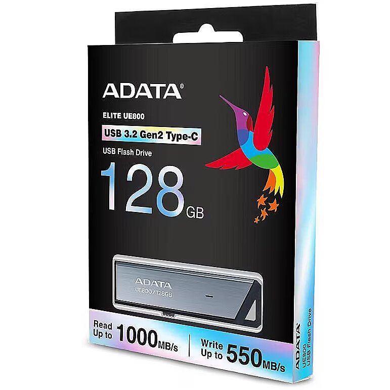 LongSummaryDescription - ADATA UE800. Capacity: 128 GB, Device interface: USB Type-C, USB version: 3.2 Gen 2 (3.1 Gen 2), Read speed: 1000 MB/s, Write speed: 550 MB/s. Form factor: Slide. Weight: 13 g. Product colour: Silver