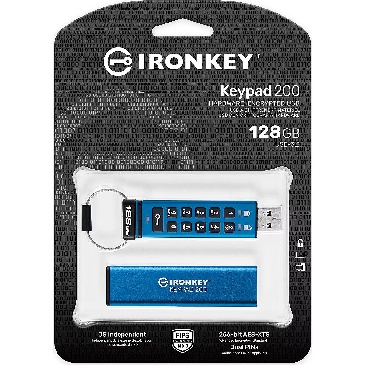 LongSummaryDescription - Kingston Technology IronKey 128GB Keypad 200, FIPS 140-3 Lvl 3 AES-256 Hardware Encrypted. Capacity: 128 GB, Device interface: USB Type-A, USB version: 3.2 Gen 1 (3.1 Gen 1), Read speed: 145 MB/s, Write speed: 115 MB/s. Form factor: Sleeve. Keypad integrated, Password protection. Weight: 25 g. Product colour: Blue