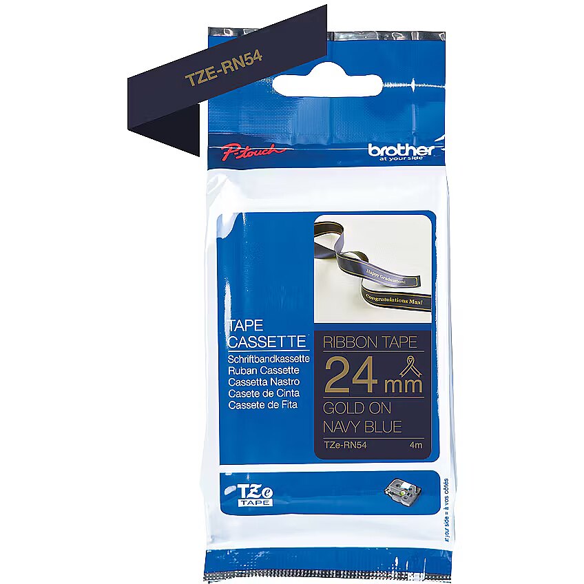 LongSummaryDescription - Brother TZE-RN54. Label colour: Gold on navy, Tape type: TZe, Product colour: Black. Tape width: 2.4 cm, Tape length: 4 m, Width: 30 mm. Pallet gross height: 16.9 cm, Master (outer) cases per pallet: 187 pc(s), Layers per pallet: 11 pc(s)