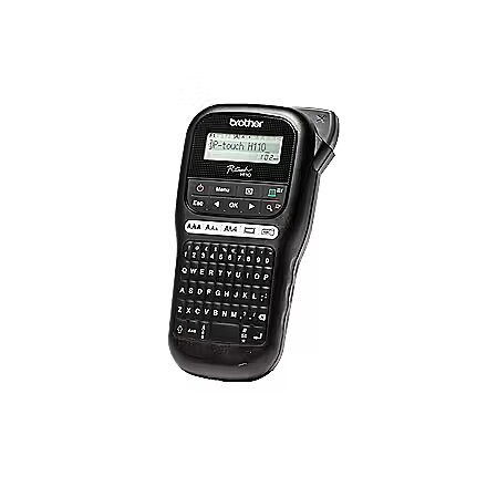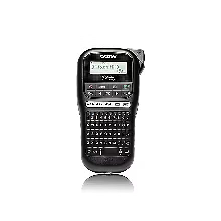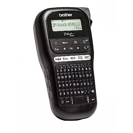 LongDesc - Portable P-touch label maker great for home, home office and on-the-go use. Features a QWERTY keyboard, convenient one-touch keys and an easy-view display to preview your labels before printing. Easily personalize your labels with 3 fonts, 14 frames, and over 250 symbols. Also organize your wires and cables with the useful cable labeling feature. Creates labels with 1 or 2 lines of text. Built-in memory stores up to 15 labels for fast reprinting. Uses durable, laminated easy-peel "TZe" tape up to 12mm (~1/2") wide. Powered by 6 AAA batteries or optional AC adapter (each sold separately). Includes 12mm starter tape.Main Features- Lightweight and portable- Easy-type QWERTY keyboard- Easy-view graphical display for easy preview before printing- One-touch keys for easy access to fonts, styles and frames- 3 fonts, 14 frames and more than 250 symbols- Useful cable labeling feature to easily organize your wires and cables- Stores up to 15 labels for quick reprinting- Prints 1 or 2 lines of text on labels up to 12mm wide (approx. ½")- Uses Brother "TZe" tapes in a variety of colors, sizes and types: standard, extra strength, acid free adhesive, cable and wire, fabric iron on and more- Flexible – Works with 6 x "AAA" batteries (not included) or optional AC adapterBrother P-touch PT-H110 Easy, Handheld Label MakerThe portable PT-H110 makes it easy to print great-looking labels anywhere. Comes with a variety of fonts, frames and symbols to personalize your labels. Uses durable, laminated Brother P-touch TZe tape.Lightweight and portable so you can create labels anywhereAdd a Personal TouchIt’s easy to personalize your labels with the PT-H110. It has 3 fonts, 5 patterns, 14 frames, and over 250 symbols.Also try out the 10 pre-designed decorative labels in the Menu section.Colors, Sizes and TypesThe PT-H110 uses Brother P-touch TZe tape in 4 different widths:3.5mm (0.13”), 6mm (0.23”), 9mm (0.35”) and 12mm (0.47”).Choose from a wide variety of colors. Also try P-touch TZe specialty tapes including:- Extra Strength Adhesive Tape- Flexible Cable Tape-Fabric Iron-On Tape- Flexible Cable Tape-Fabric Iron-On TapeHang Tough!Brother P-touch TZe tape is laminated, making it durable indoors and outdoors. It’s smudge and fade resistant. It stands up to home, business and industrial use.P-touch TZe tape has a split back for easy application.Brother is At Your SideThe P-touch PT-H110 Label Maker comes with a 1-year limited warranty and free phone support for the life of the product.