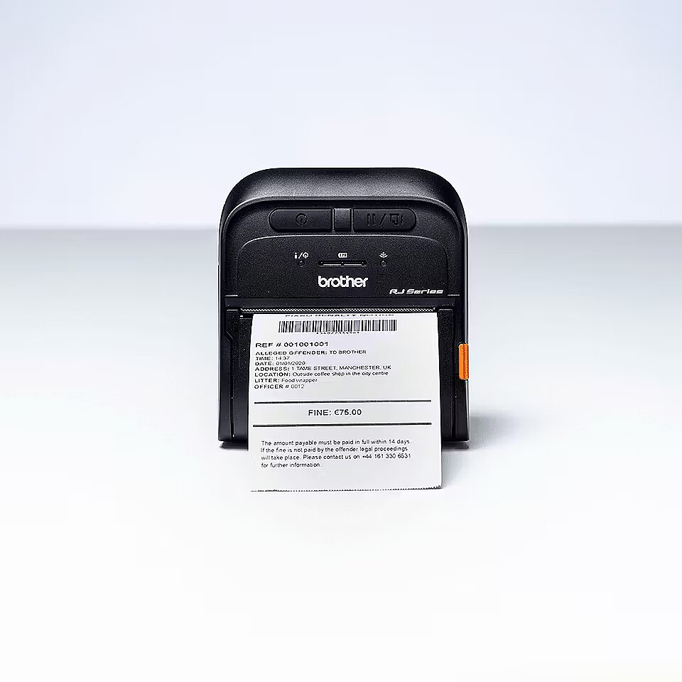 LongSummaryDescription - Brother RJ-3035B. Print technology: Direct thermal, Type: Mobile printer, Maximum resolution: 203 x 203 DPI. Maximum roll diameter: 4 cm, Supported paper width: 80 mm, Maximum printing width: 7.2 cm. Connectivity technology: Wired & Wireless, USB connector: Micro-USB B, Bluetooth profiles: SSP. Built-in barcodes: AZTECCODE, Code 128 (A/B/C), Code 39, Data Matrix, EAN13, EAN8, GS1 DataBar, GS1 DataBar Expanded,..., Internal memory: 32 MB, Flash memory: 16 MB. Product colour: Black