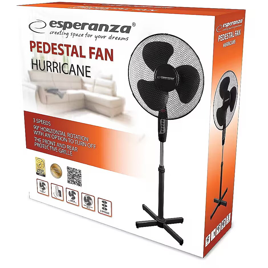 Description - Esperanza HURRICANE floor fan. Stylish appearance and available colors will make it easy to fit into any type of room, both office and home. The grid cover of the rotating blades - front and rear - passed the "child's finger test" and guarantees safety. The device is characterized by high stability thanks to the use of a cross base equipped with anti-slip pads. Additionally, it has a positioning light, thanks to which you can quickly determine its location in a dark room. Let the quiet wind quickly and efficiently cool your office or home.
