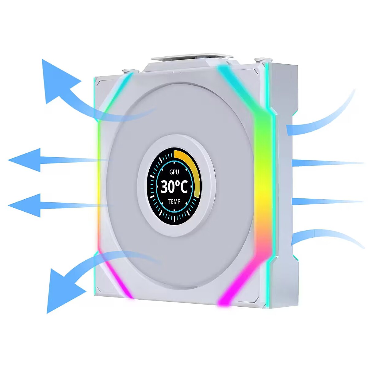The UNI FAN SL Wireless series not only shows innovation in functionality but also enhances its visual appeal. Each side of the fan now features an additional light strip, increasing the total number of LEDs to 40. This enables duo-zoned lighting adjustments, delivering a more dynamic and versatile visual experience that truly stands out. PRACTICAL AND STYLISH LCD SCREEN