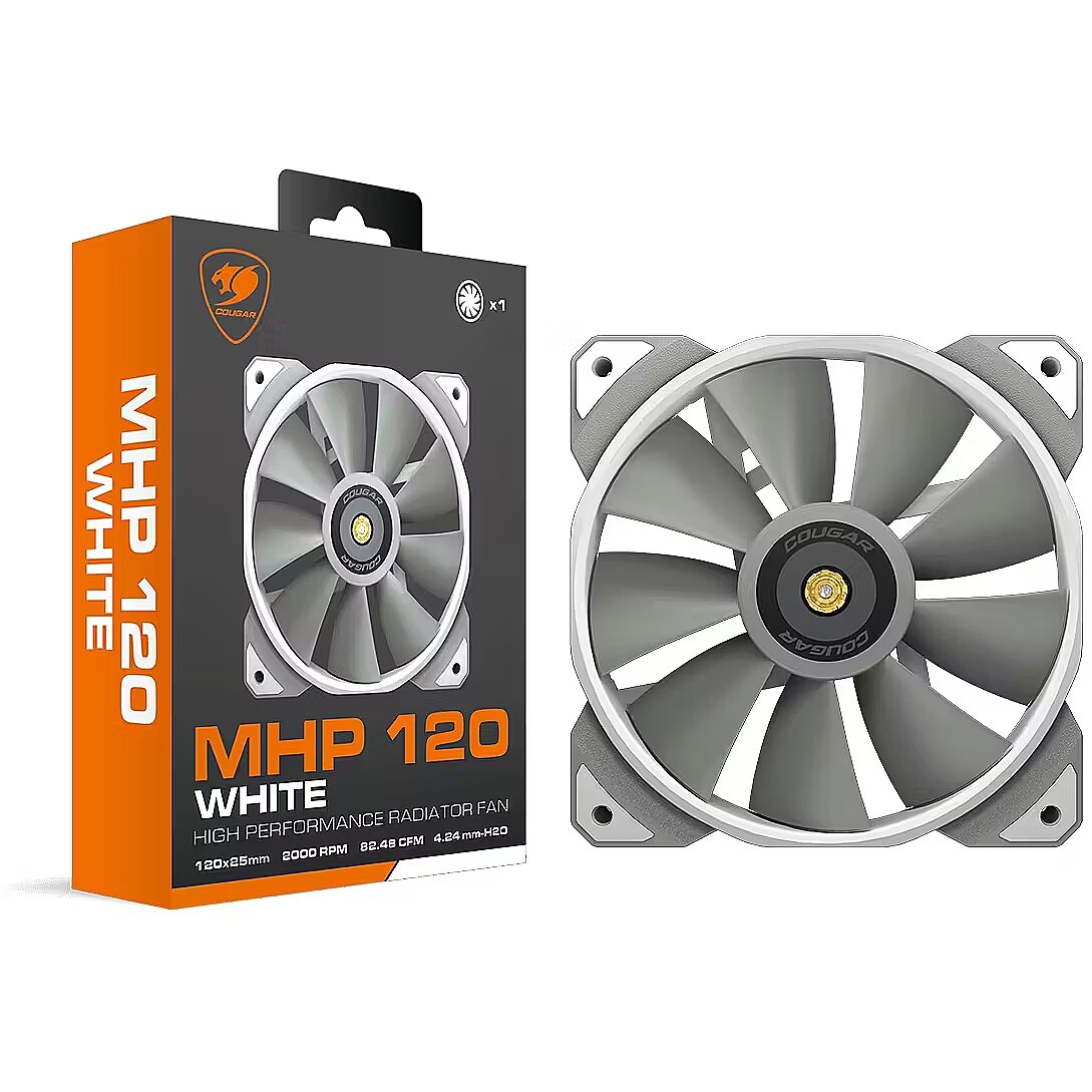 LongSummaryDescription - COUGAR CGR-CF-MHP12HB-W. Type: Air cooler, Fan diameter: 12 cm, Airflow: 143.53 m³/h, Maximum air pressure: 4.24 mmH2O. Width: 120 mm, Depth: 120 mm, Height: 25 mm. Product colour: White