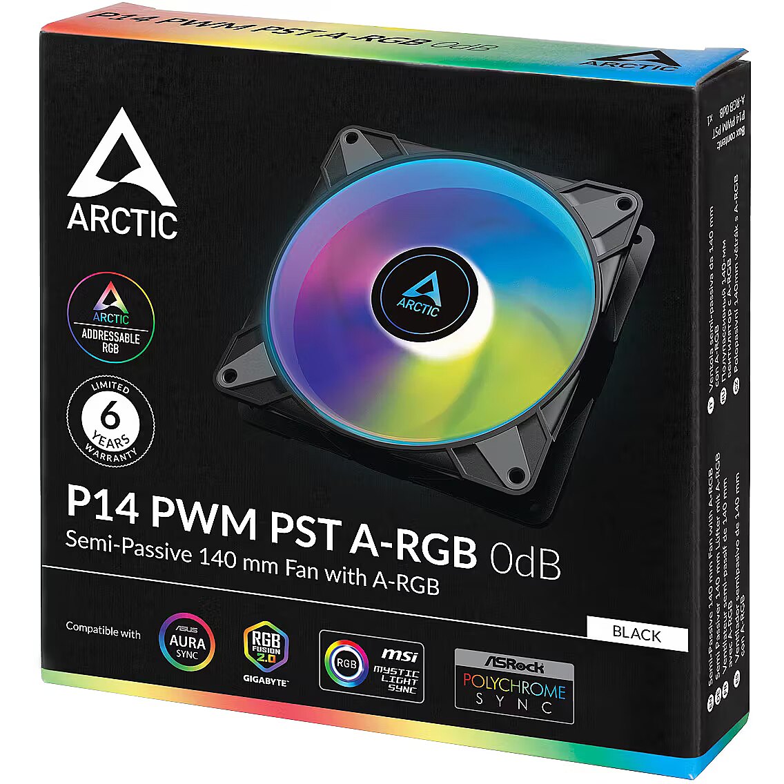 LongSummaryDescription - ARCTIC P14 PWM PST A-RGB 0dB - Semi-Passive 140 mm Fan with Digital A-RGB. Type: Fan, Fan diameter: 14 cm, Rotational speed (min): 0 RPM, Rotational speed (max): 1900 RPM, Noise level: 0.3 sone, Airflow: 117.06 m³/h, Bearing type: Fluid Dynamic Bearing (FDB). Voltage: 12 V. Width: 140 mm, Depth: 140 mm, Height: 27 mm. Product colour: Black