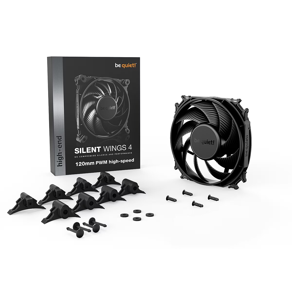 Description - UNCOMPROMISING SILENCE AND PERFORMANCE The Silent Wings 4 120mm PWM high-speed combines all the features of a virtually inaudible fan with an extremely powerful fan for the most demanding applications. Optimised fan blades for highest performance on heatsinks and coolers. Small clearance between fan blades and fan frame and funnel-shaped air outlet for extremely high air pressure  Extremely quiet operation even at maximum speed 6-pole fan motor for reduced vibration and energy consumption Anti-vibration mounting with push-pin fasteners or screws  Extremely long service life of up to 300,000 hours Elegant design in all-black colour, with high-quality decoration  Equally quiet and efficient operation The Silent Wings 4 120mm PWM high-speed is the fan of choice for all possible applications. Whether in the case, on heatsinks or coolers, features such as the silent-optimised fan blades and the funnel-shaped fan frame make the Silent Wings 4 120mm PWM high-speed a fan that makes no compromises between virtually inaudible operation and high performance. Minimum distance for maximum air pressure The Silent Wings 4 120mm PWM high-speed ensures maximum air pressure and thus a significant increase in system performance. This is made possible by the reduced distance between the fan blades and the frame. This allows the Silent Wings 120mm PWM high-speed to be used in even the most demanding configurations.   For any application The Silent Wings 4 120mm PWM high-speed has 2 mounting options included. The pre-installed anti-vibration mount keeps noise-generating vibrations to a minimum. For coolers and heatsinks, the plastic mount is the best choice. What both solutions have in common is that they allow virtually inaudible operation at standard speed. The key to virtually inaudible operation when needed The 6-pole fan motor with 3 phases ensures very low energy consumption, less vibration and thus quiet operation at a maximum of 31.2 dB(A). Equipped with this state-of-the-art technology, the fan ensures smooth operation and thus reduces costs. For balanced operation The advanced hydrodynamic bearing (FDB) guarantees a very long fan life of up to 300,000 hours. In addition, it significantly reduces vibrations and supports the virtually inaudible operation of the Silent Wings 4 120mm PWM high-speed. Great looks from all sides Whether as a fan on the cooling or in the case: the Silent Wings 4 120mm PWM high-speed always makes a good impression. The all-black design combined with the high-quality sticker makes the fan stand out in any configuration. The Silent Wings 4 120mm PWM high-speed is a high-performance and incredibly good-looking fan.