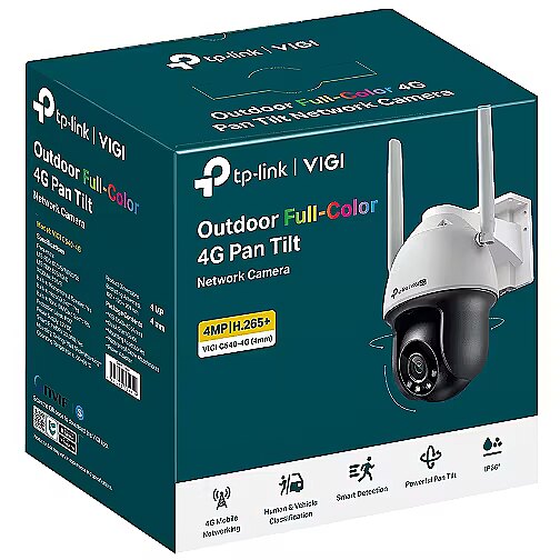 Description - VIGI 4MP Outdoor Full-Color 4GPan Tilt Network Camera. 4MP Super-High Definition: The camera comes with 4MP–more than enough pixels to pick up some of the more discrete details. 24h Full-Color: Experience clear, vibrant 24-hour monitoring, even in total darkness. 4G Mobile Networking: Enjoy hassle-free installation and simple monitoring in places where the internet is not available. 360° Monitoring: Cover every corner and eliminate blind spots. Human & Vehicle Classification: Distinguishes humans and vehicles from other objects, so you receive more accurate event notifications. Smart Detection: Actively detects abnormal events like area intrusion and line-crossing, sending notifications to you instantly. Automatic Tracking: Automatically tracks persons or vehicles of interest and provides seamless and longer video. Active Defense: Warn potential intruders instantly with sound and light when abnormal events. Two-Way Audio: With voice intercom support, carry two-way conversations while watching your feed from anywhere. H.265+: Compresses the video size without sacrificing video quality, easing the network load and saving disk space. IP66 Waterproof: Reliable IP66 for stable outdoor performance. Remote Management: Take full control over your security anytime and anywhere on the VIGI app or PC client.