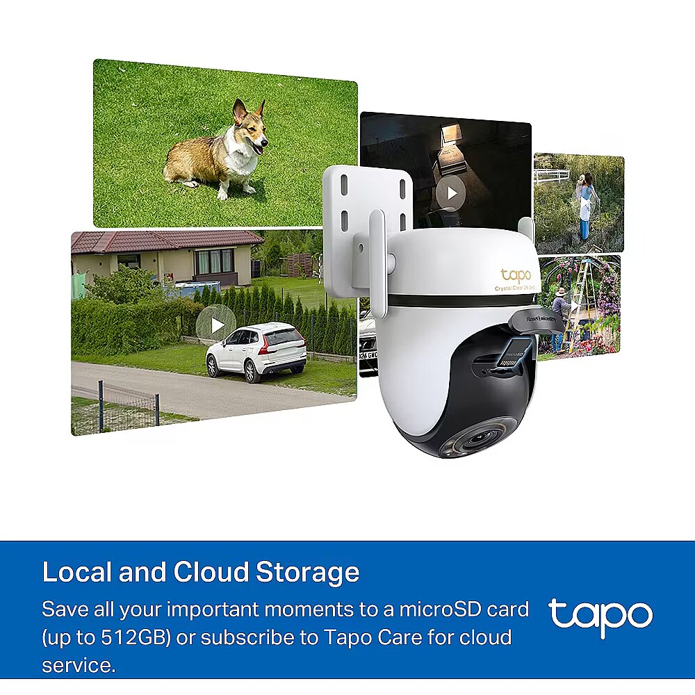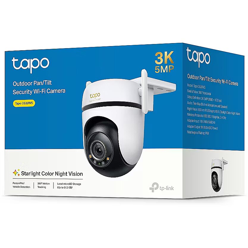 Description - TP-LINK TAPO C530WS Outdoor Pan/Tilt Security Wi-Fi Camera 3K 5MP Live View-Adopting a 2880 × 1620 resolution, Tapo C530WS offers enhanced video quality to see more details. Starlight Color Night Vision-Enhances your security by revealing brighter, full-color images and vivid details even in low-light conditions with built-in spotlights and the starlight sensor. 360° All-Round Protection-Enjoy 360° horizontal and 130° vertical views with motion tracking to eliminate blind spots. Activate patrol mode to cruise among multiple custom points. Comprehensive AI Detection-Smart AI accurately identifies people, pets, and vehicles while featuring tamper and line-crossing detection, minimizing false alerts and unnecessary notifications. Flexible Connections & Reliable Networking-Connect your camera via Wi-Fi or Ethernet for flexible installation. Powerful dual antennas ensure connectivity up to 492ft in open areas.* IP66 Weatherproofing-Offers excellent waterproof and dustproof performance for outdoor scenarios. It works well in rain, dust, and heat. Customizable Sound and Light Alarm-The ultra-bright adjustable light deters unwanted visitors, while custom audio alarms offer further use. Secure Local & Cloud Storage-Save crucial moments to a microSD card† (up to 512 GB) or subscribe to Tapo Care for cloud storage‡ after a 30-day free trial, ensuring you never lose important footage. Two-Way Audio-Enables communication through a built-in microphone and speaker.