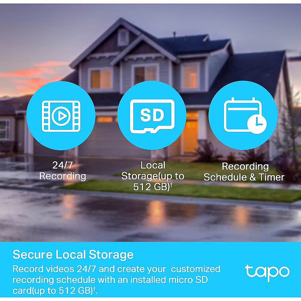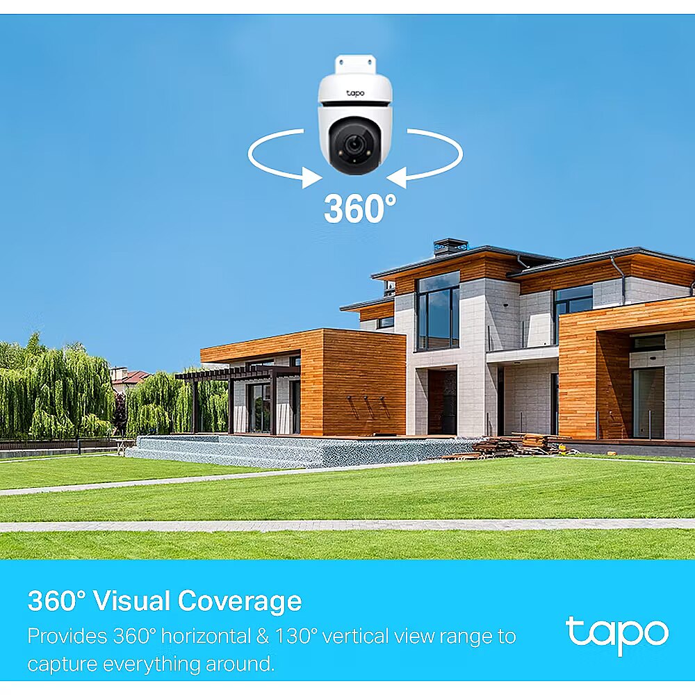 Description - View in FullHD 1080p - Clear and crisp image, with lots of details. People Detection and Motion Tracking - Smart AI identifies people while tracking motion with high rotation speed and notifies users when necessary. 360° View Range - Provides 360° horizontal coverage and 130° vertical coverage. Night Vision (up to 30m) - Keeps you safe with a clear view up to 30m, even in total darkness. Sealing class IP65 - Excellent protection against water and dust in outdoor conditions. Multiple Mounting Options - Use mounting screws, templates, or ties to mount the camera to any wall, ceiling, or pole. Selection of storage location - Record video on a microSD card (up to 512 GB), or using the Tapo Care cloud storage service. Personalized alarm sound - Record your own sound as an alarm to enhance the camera's capabilities. Physical Privacy Mode - Maintain your privacy by covering the lens with a housing. Two-way audio transmission - Built-in microphone and speaker will enable effective communication through the camera. We recommend using microSD cards intended for monitoring.