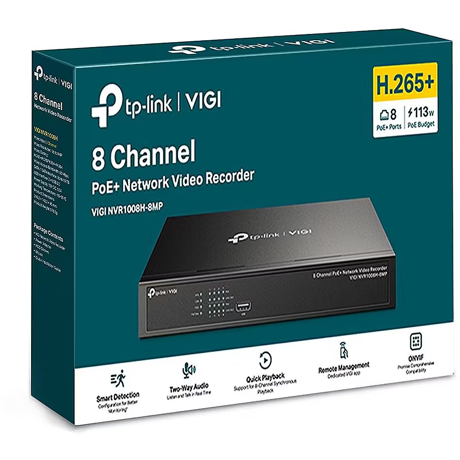 LongDesc - Security Never Shuts DownVIGI NVR1008H-8MP 8 Channel PoE+ Network Video RecorderEvery angle all on one screen.4K HDMI Video Output & 16MP Decoding CapacitySharp image definition up to 8MP and an 8-channel display ensures you capture every detail, from every angle.Dedicated 8 PoE+ ports (113 W budget) for simplified IP camera deployment.Features 8× 10/100Mbps PoE+ ports, the NVR supports up to 30 W on each PoE+ port. Designed to use a single Ethernet cable for both data and power transmission, it offers flexible installation to fit in various surveillance scenarios for small businesses, such as groceries, warehouses, restaurants, and financial institutions.Reviewing footage is faster than ever.8-Channel Simultaneous PlaybackReplay the feed from up to 8 cameras at the same time, increase replay speed, and find events in the video schedule to easily review footage.More compression. More savings. Same quality.Without using any extra bandwidth, your cameras transmit compressed crystal-clear video to save disk space, ease network loads, and reduce monitoring costs without sacrificing image quality.No need to check long compatibility lists.ONVIF Ensures CompatibilityEasily add IPCs from VIGI and other brands to establish a powerful and varied network thanks to barrier-free compatibility.Plug & Play.Allows new and unused VIGI IP Cameras to be added automatically to the new NVR and activated instantly, making installation faster than ever before.Security for every hour and every day.24/7 Continuous RecordingStores up to 10 TB of footage from managed cameras to secure your data for quick, convenient access.Keep an eye on things even when you are on the move.Remote MonitoringThe dedicated VIGI app, web UI, and VIGI Security Manager enable remote monitoring, providing ease and convenience.Flexible installation gives you more convenience.Choose the suitable installation method by simply housing your NVR on a rack, or placing it on or under a desk.Greet your visitors before they enter.Two-Way AudioWith voice intercom support, carry two-way conversations while watching your feed from anywhere. Suitable for management.One system. Full security.Run your business with peace of mind.The VIGI professional surveillance system by TP-Link is dedicated to protecting the business you’ve worked hard to build — whenever, wherever. Our outstanding functions, reliable quality guarantees, and simplified installation work together to ensure your business stays safe and sound.