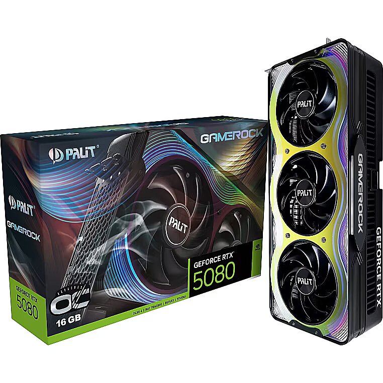 Description - GeForce RTX™ 5080 GameRock OC GameRock: A Fusion of Art and Power The Palit GameRock series combines stunning aesthetics with powerful performance. Its Chameleon Panel offers dynamic, ever-changing colors with ARGB Sync Evo support for easy synchronization of lighting. Advanced cooling features like TurboFan 4.0, Air Deflector, Composite Heat Pipes, and a Vapor Chamber ensure optimal thermal performance. Designed to dazzle and deliver, GameRock is perfect for gamers, creators, and AI enthusiasts.