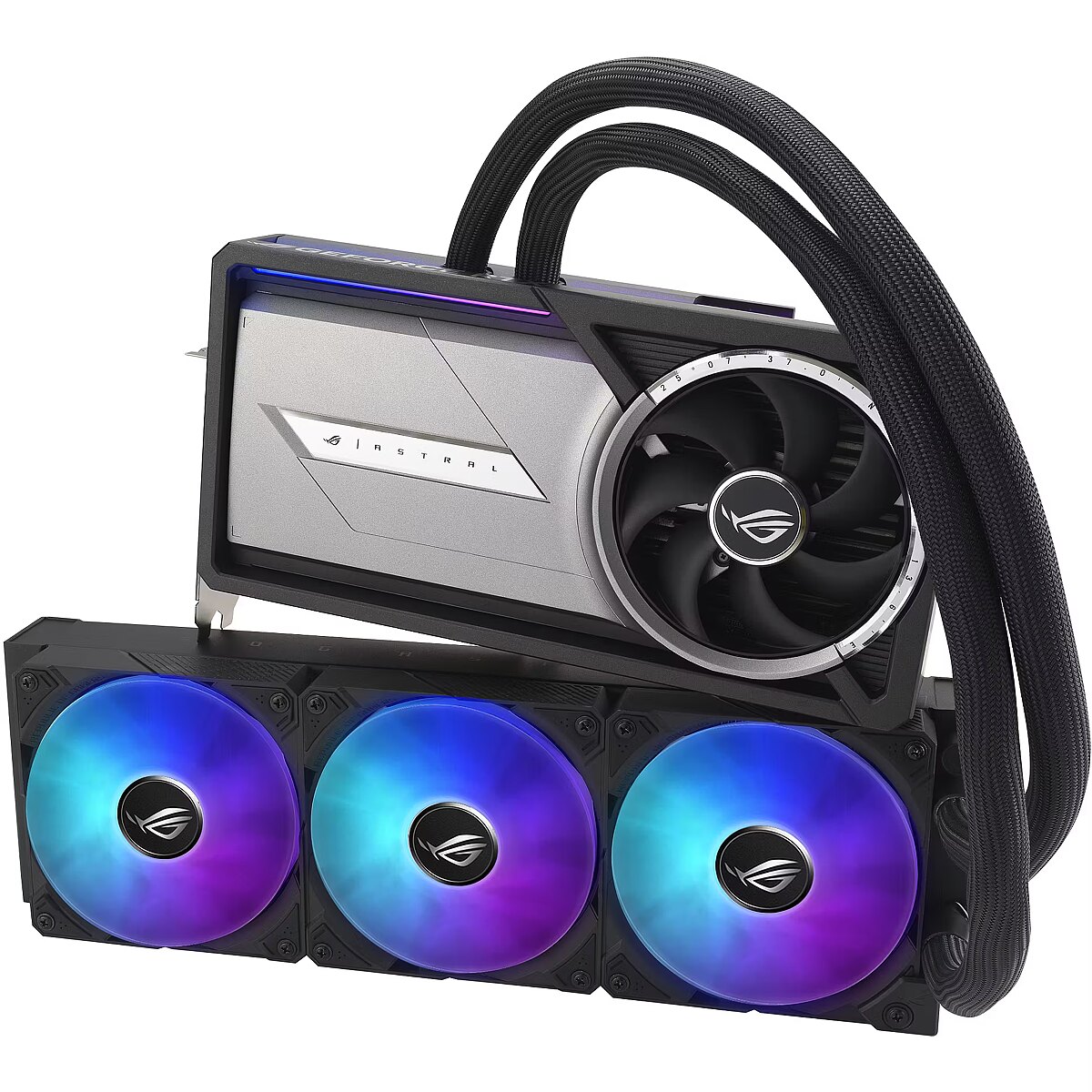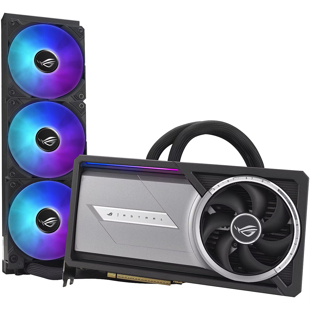 LongDesc - ROG Astral LC GeForce RTX™ 5090Fluid ForceThe new ROG Astral family was inspired by the limitless expanse and beauty of the cosmos, and it is a testament to an unending dedication to exploring and defining new frontiers. The ROG Astral LC GeForce RTX 5090 delivers pinnacle cooling performance via a premium 360mm AIO cooler, full-coverage copper plate and integrated fan. Meanwhile, powerful 80-amp MOSFETs deliver high overclocking potential while maintaining quiet operation.Cooling Expertise360mm RadiatorAn extra-thick 360x38mm radiator combines forces with a trio of high-end fans to ensure excellent heat dissipation.Full-Coverage Cold PlateThe full-coverage cold plate covers all the heat-generating components on the PCB, empowering the radiator to efficiently cool the graphics card, resulting in up to 30% better performance versus pure air cooling.On-Board CoolingHeat produced by power-delivery components is dispelled by an axial-tech fan and a low-profile heatsink under the shroud. This combination exhausts hot air quietly and efficiently.Phase-Change GPU Thermal PadBy melting to effectively fill the gaps between the GPU and the thermal module, a premium phase-change GPU thermal pad provides superior thermal conductivity and enhanced heat dissipation, ensuring optimal performance and longevity for graphics cards under heavy loads.Premium Power DeliveryPowerful 80-amp MOSFETs deliver over 35% more headroom than the standard design. This helps ensure enhanced performance, stability and higher overclocking potential.ASUS GPU Guard & BracketTo handle larger graphics processors, ASUS GPU Guard applies adhesive to secure all four corners to reduce the risk of cracks, while a GPU bracket helps ensure uniform mounting pressure and extra stability.Protective PCB CoatingA protective conformal coating envelops the circuit board to help protect against short-circuits caused by moisture, dust or debris.Auto−Extreme TechnologyAn automated manufacturing process that sets new standards in the industry by allowing all soldering to be completed in a single pass, ASUS Auto-Extreme technology reduces thermal strain on components and avoids the use of harsh cleaning chemicals, resulting in less environmental impact, lower manufacturing power consumption and a more reliable product overall.